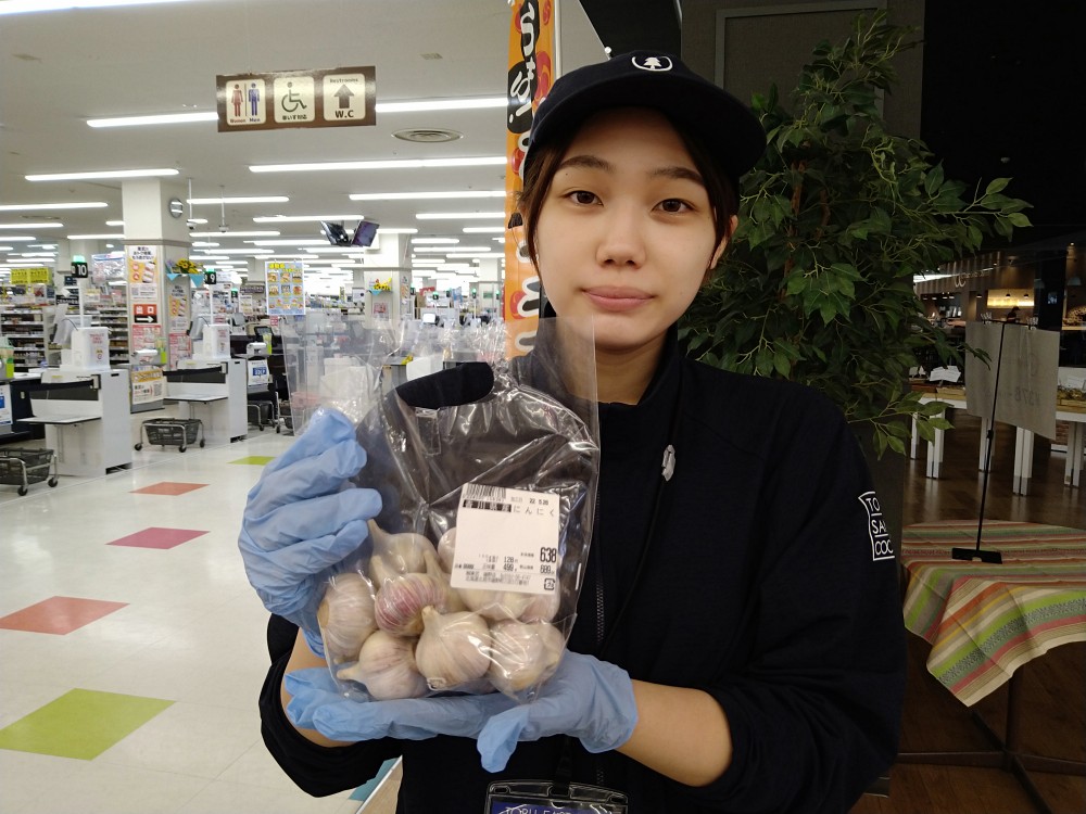おはようございます。青果コーナーでは、香川産新にんにく100g当り128円(本体価格)にて販売しております。香りがあり、加熱するともちもちの食感。丸ごと揚げたり、BBQのお供に。