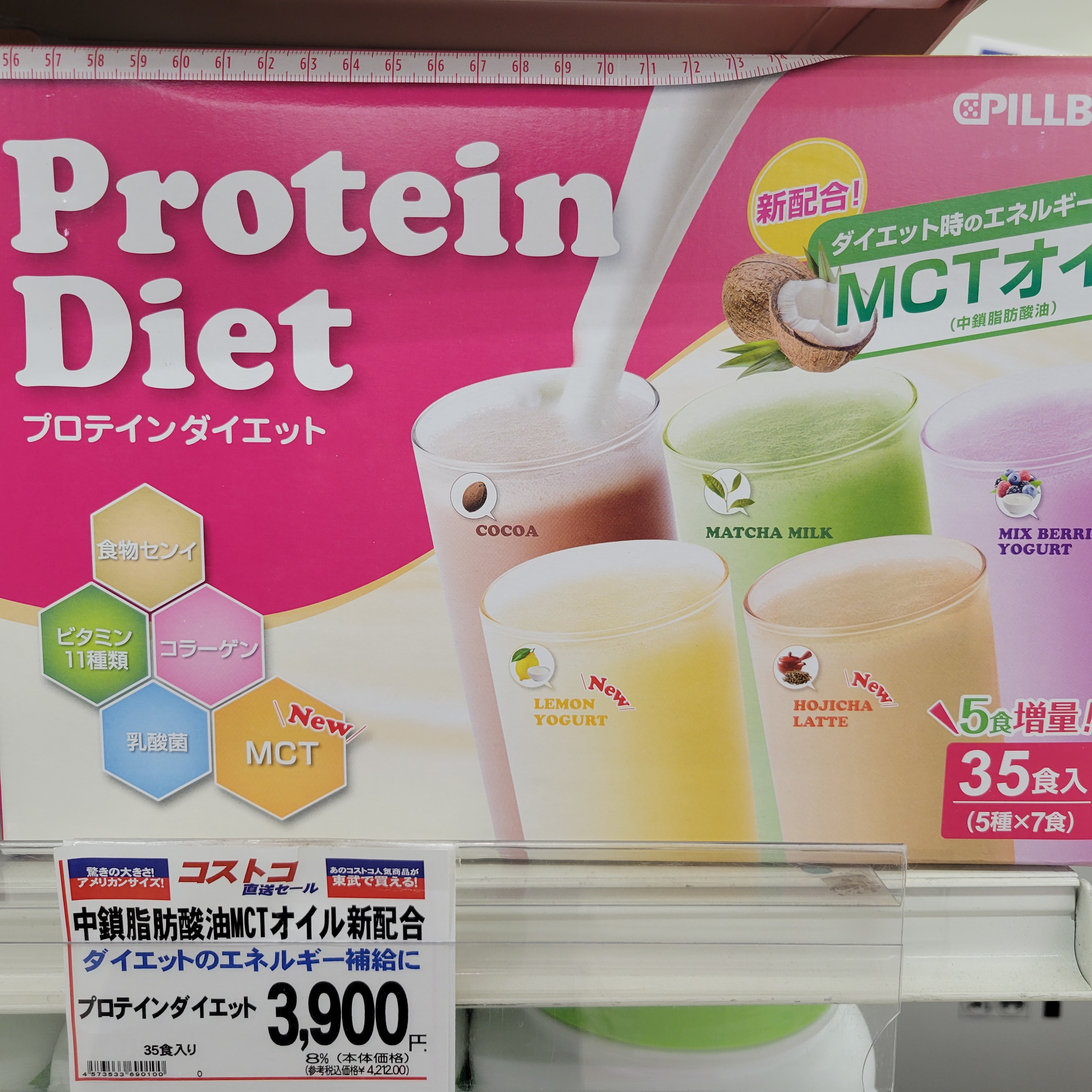 ソフトコーナーからは、本日コストコフェア!ダイエット時のエネルギー補給に!プロテインダイエット 新配合!MCTオイル配合! 価格は5種類×7食入り35食入りで3900円です。是非お買い求めくださいませ。