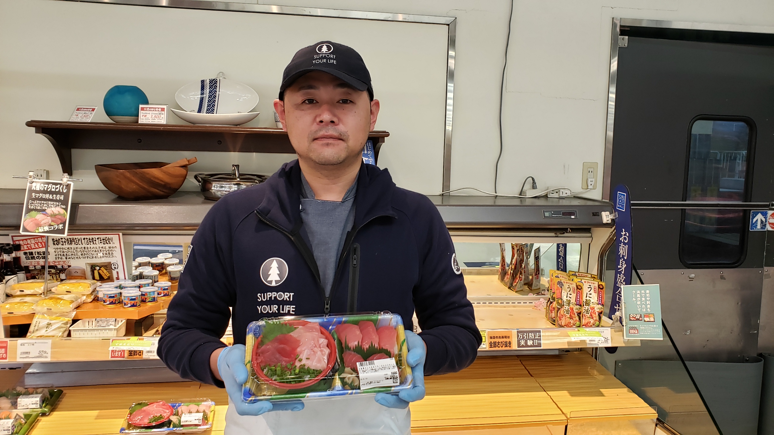 鮮魚コーナーのオススメ!お魚やさんのマグロ、丼セット。 赤身、中トロ、大トロとすべての部位が楽しめるマグロづくしの1品です。