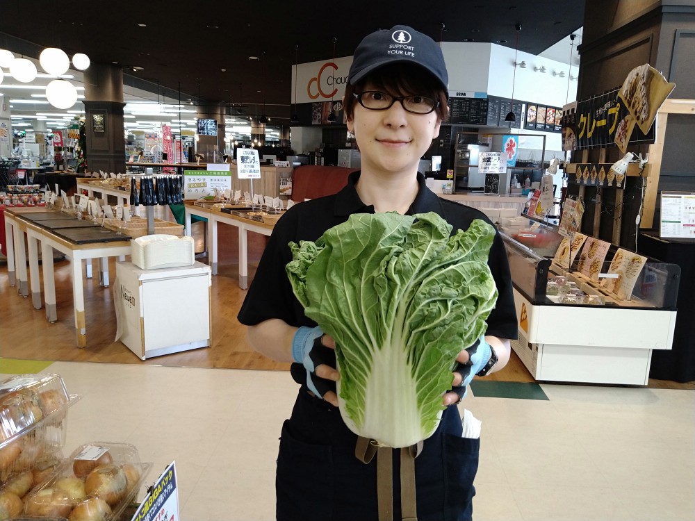 おはようございます。青果コーナーでは、北見産白菜1玉199円(本体価格)にて販売しております。暑い日はさっと火を通してサラダや焼肉などにいかがですか?どうぞお召し上がりください。