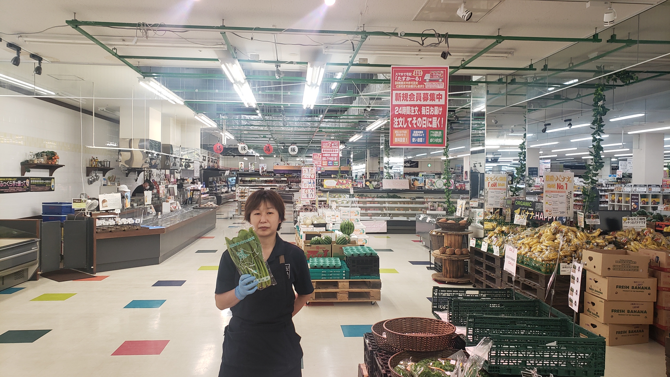 青果コーナーのオススメ、北海道産小松菜がお買い得。1袋99円にて販売します