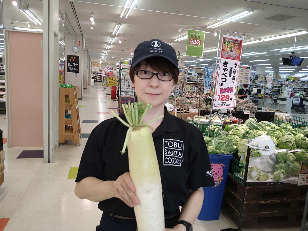おはようございます。青果コーナーでは、北海道産大根1本198円(本体価格)にて販売しております。さっぱりとサラダや、素麺や冷や麦など麺のつけ汁にいかがですか?どうぞ御賞味ください。