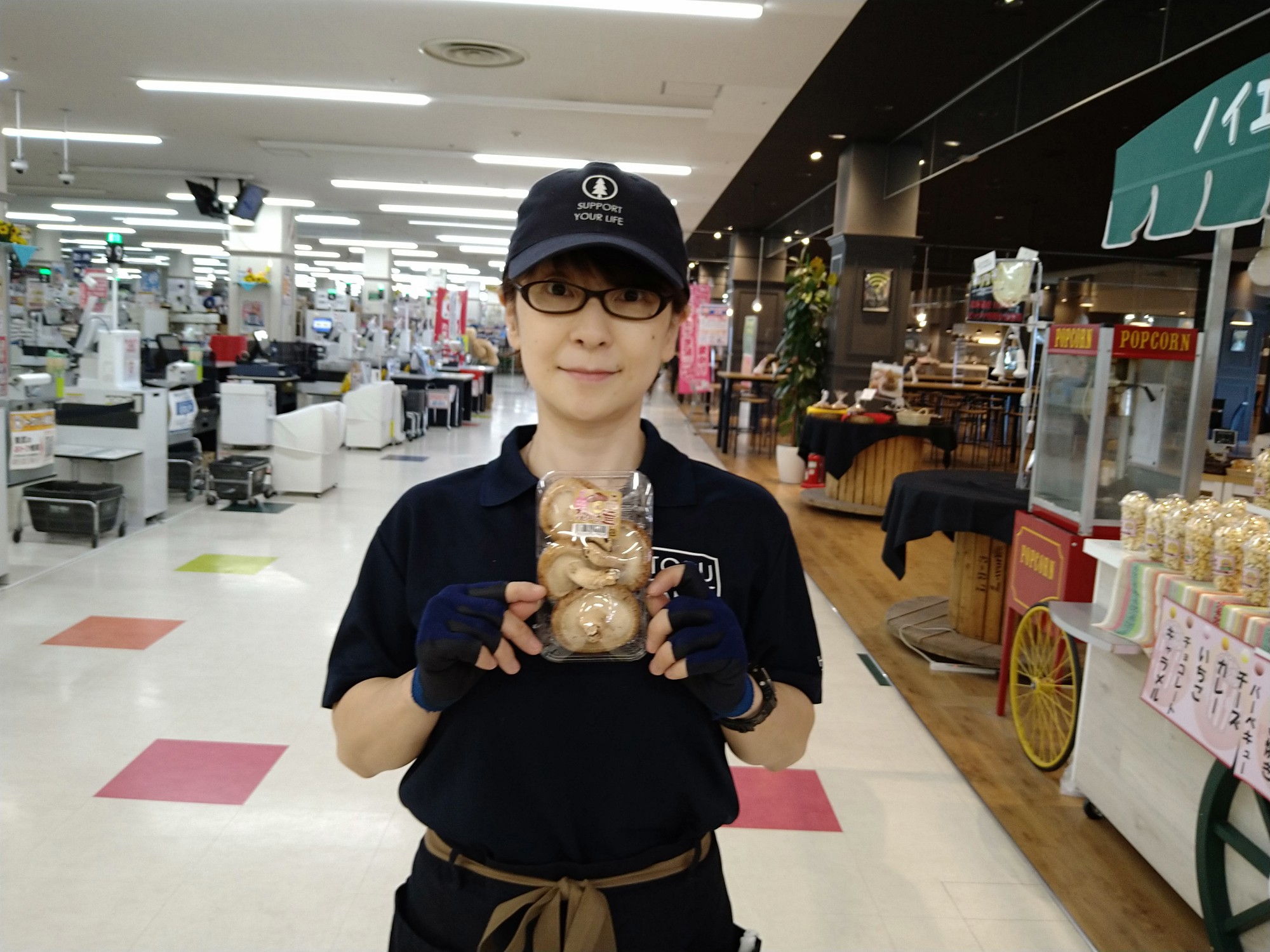 おはようございます。青果コーナーでは、中標津産生椎茸1パック99円(本体価格)にて販売しております。焼肉のお供に、煮物や炒め物にどうぞお召し上がりください。