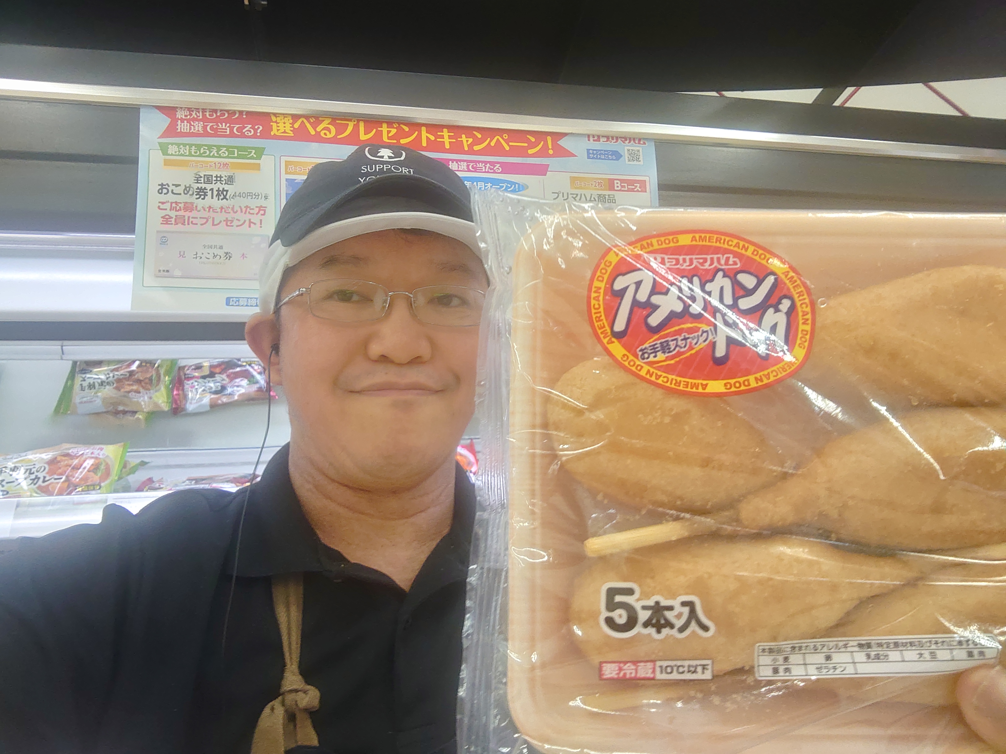 おはようございます。ミート担当近藤です。外はサクッ、中はふんわりとした生地でソーセージを包んだアメリカンドッグです。人気のスナックメニューです。