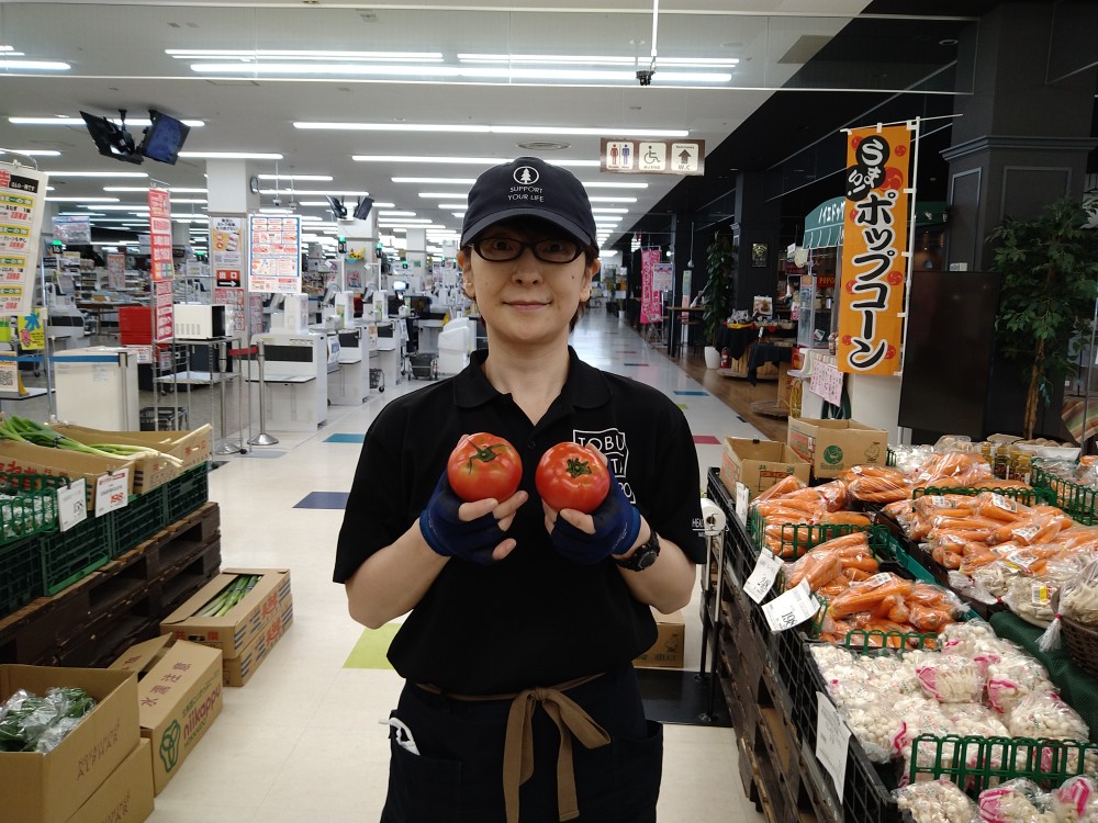 おはようございます。青果コーナーでは、北海道産とまと1玉77円(本体価格)にて販売しております。冷やして丸かじりやサラダ、冷やし中華などにいかがですか?どうぞお召し上がりください。
