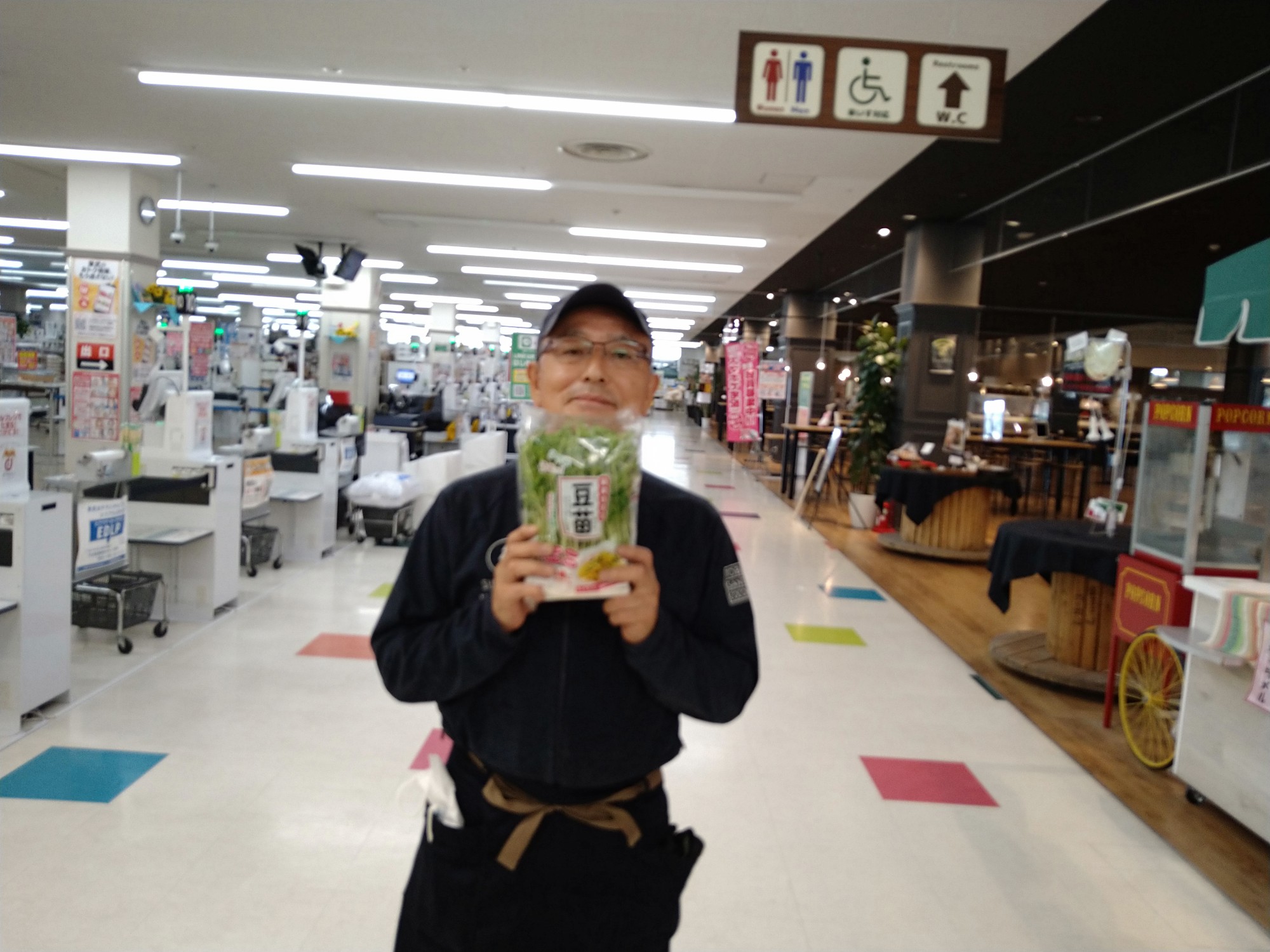 おはようございます。青果コーナーでは、山梨産豆苗1袋99円(本体価格)にて販売しております。炒め物やサラダ、おひたし等に使えます。残った根元を水に浸しておくと、新しい芽が出てきます。どうぞお召し上がりください。