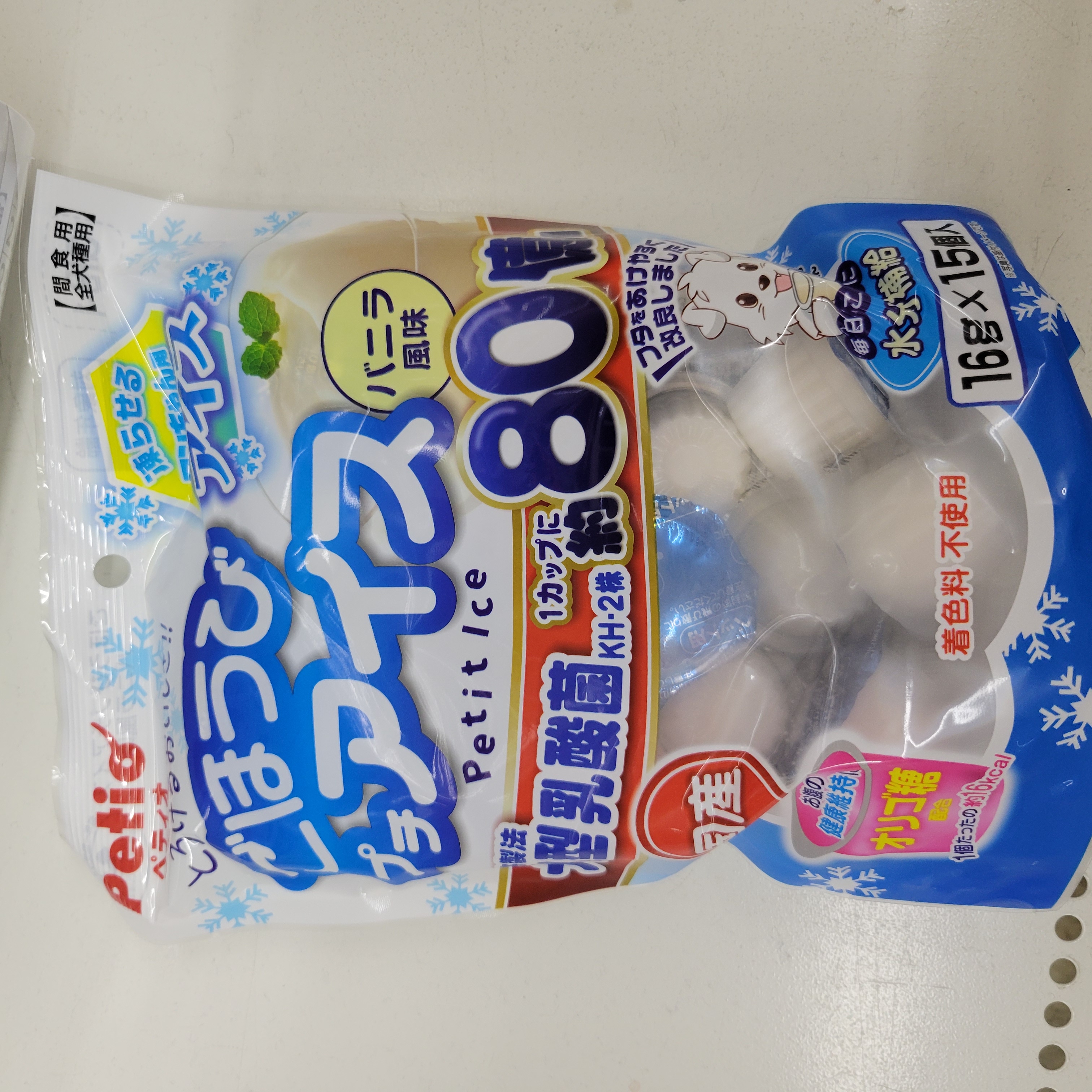 ペットコーナーからは、暑い日におすすめ!ごほうびプチアイス バニラ風味味です。お腹の健康維持にオリゴ糖配合。価格は15コ入りで368円です。是非お買い求めくださいませ。