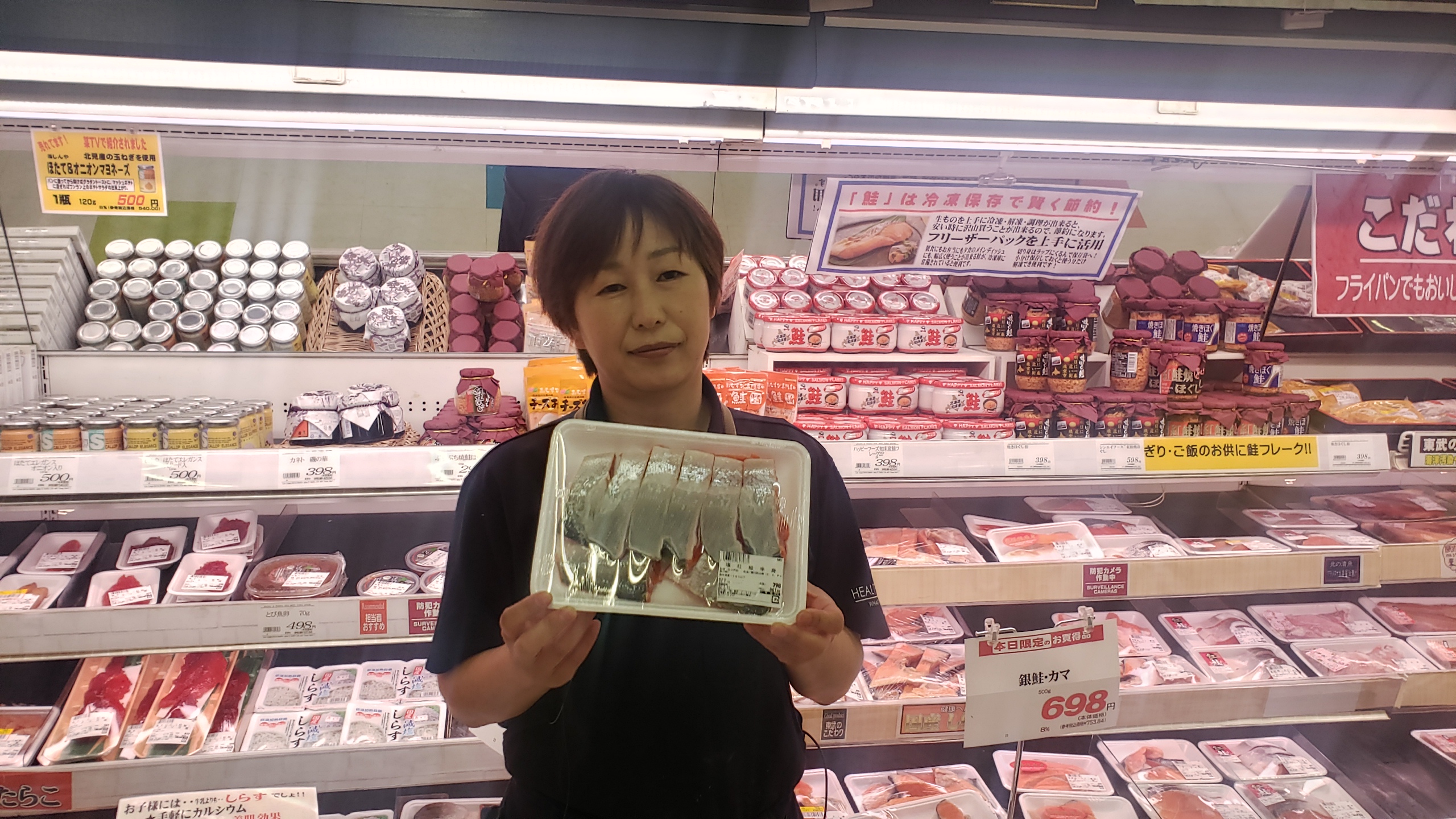 本日の鮮魚コーナーからのおすすめです。 紅鮭半身切り身1パック798円(税抜き)となっております。朝食、お弁当のおかずにいかがでしょうか…是非ご来店ご利用お待ちしております