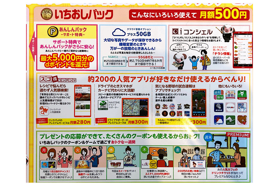スマホにべんり・おトク・あんしんなドコモのおすすめサービスをぎゅぎゅっと詰め込んだ「いちおしパック」は、有料アプリ・コンテンツが使い放題のスゴ得コンテンツだけでなく、毎日抽選プレゼントや必ずもらえる毎日おトクな割引クーポン、スマホ紛失・故障時にdポイントがもらえる「あんしんパックモバイルサポート特典」やクラウド容量オプションなどお得満載です!