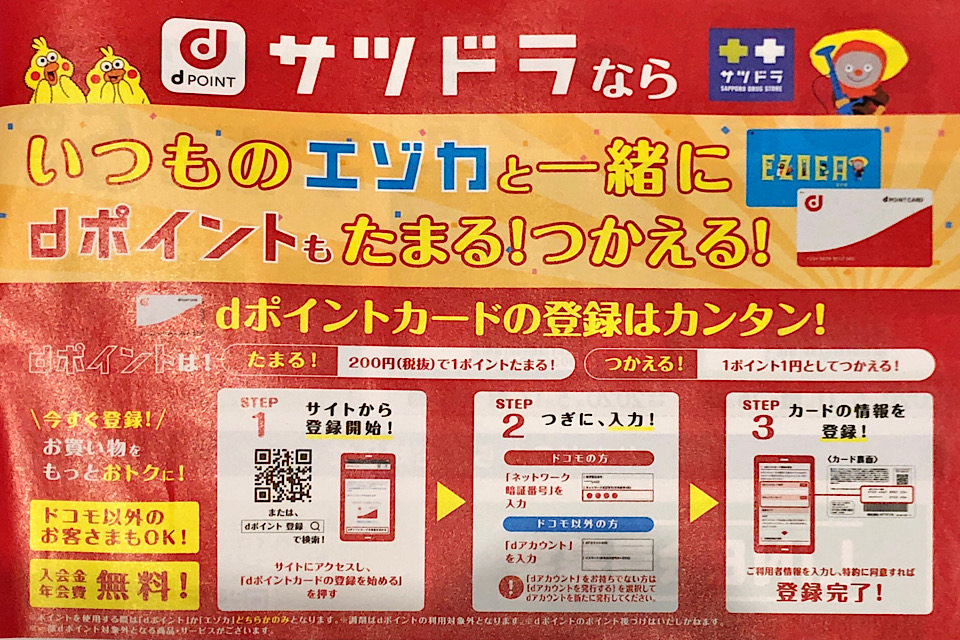 サツドラでのお買い物は、エゾカと一緒にdポイントも出すと、両方ポイントが貯まっておトクですよ!