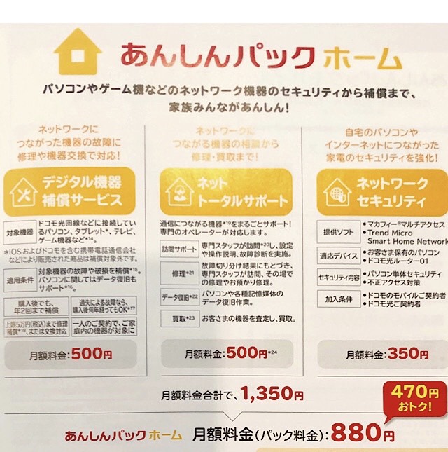 ご自宅でドコモ光回線などに接続しているパソコン、タブレット、テレビ、ゲーム機などの故障や破損を補償する「デジタル機器補償サービス」、接続機器の設定や故障診断を専門オペレーターが対応する「ネットトータルサポート」、家電のセキュリティを強化する「ネットワークセキュリティ」など、盛りだくさんのサービスですので、ぜひご利用下さい!