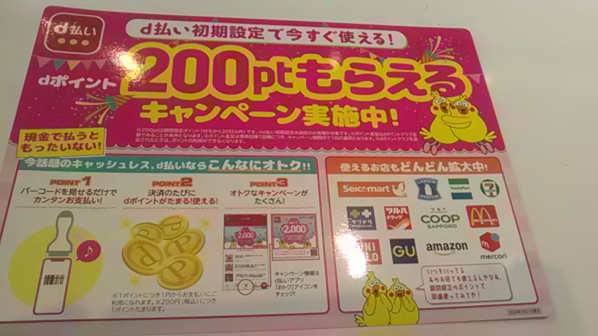 キャッシュレスを気軽に始めるチャンスです⭐︎店頭でd払いの初期設定をして頂くとドコモポイント200ポイントプレゼント🎁7月末までのキャンペーンですので、まだ使ってない方はぜひこの機会に♫
