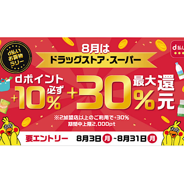 今月の「d払い」は、ドラッグストア・スーパーでご利用いただくと、dポイント最大+30%還元する「お買い物ラリー」キャンペーンを実施中です!