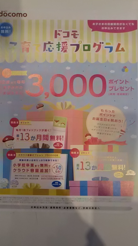 12歳以下のお子様いるお客様、ドコモの子育て応援プログラムの登録はお済みですか?(^^)