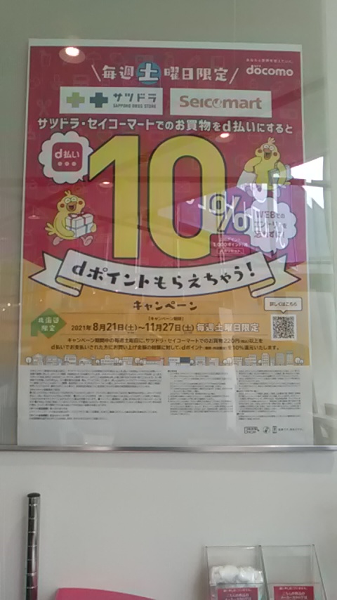 こんにちは、ドコモショップ中標津店です。11月27日までの期間中、毎週土曜日にサツドラ・セイコーマートでのお買物220円(税込)以上をd払いでお支払いされた方に、お買い上げ金額の総額に対してdポイント(期間・用途限定)を10%還元するキャンペーンを実施中です!