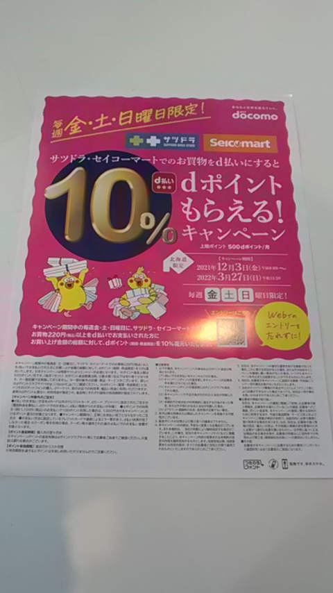 こんにちは、ドコモショップ中標津店です^ ^サツドラ・セコマのお買い物でd払いを利用すると10%分のdポイントがもらえるキャンペーンが新たに始まりました!