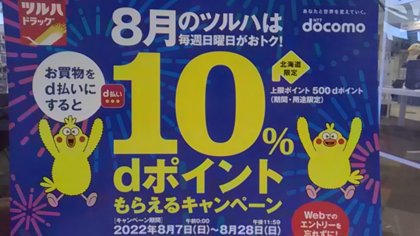 こんにちは、ドコモショップ中標津店です!今月のツルハ日曜日限定「dポイント10%もらえるキャンペーン」はもうご利用いただけましたか?