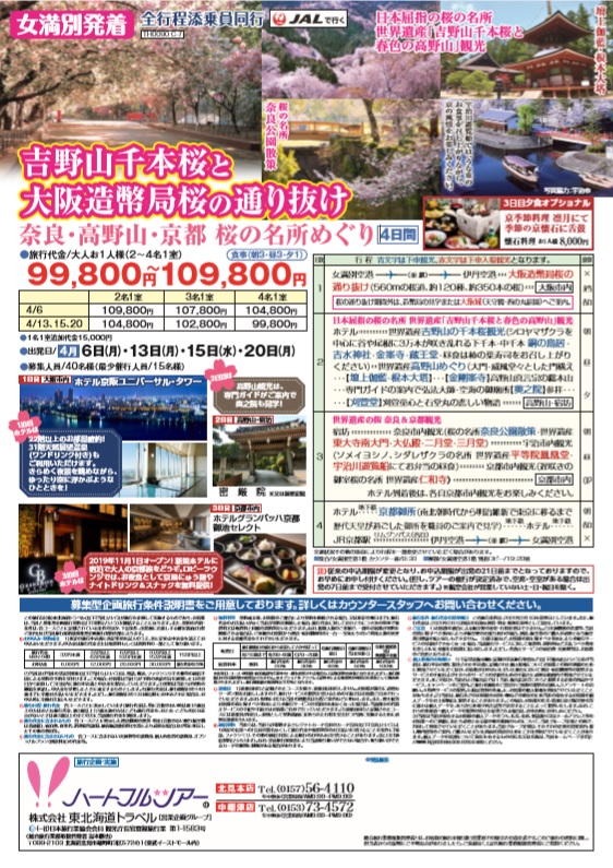 女満別空港発着、吉野山千本桜と大阪造幣局桜など