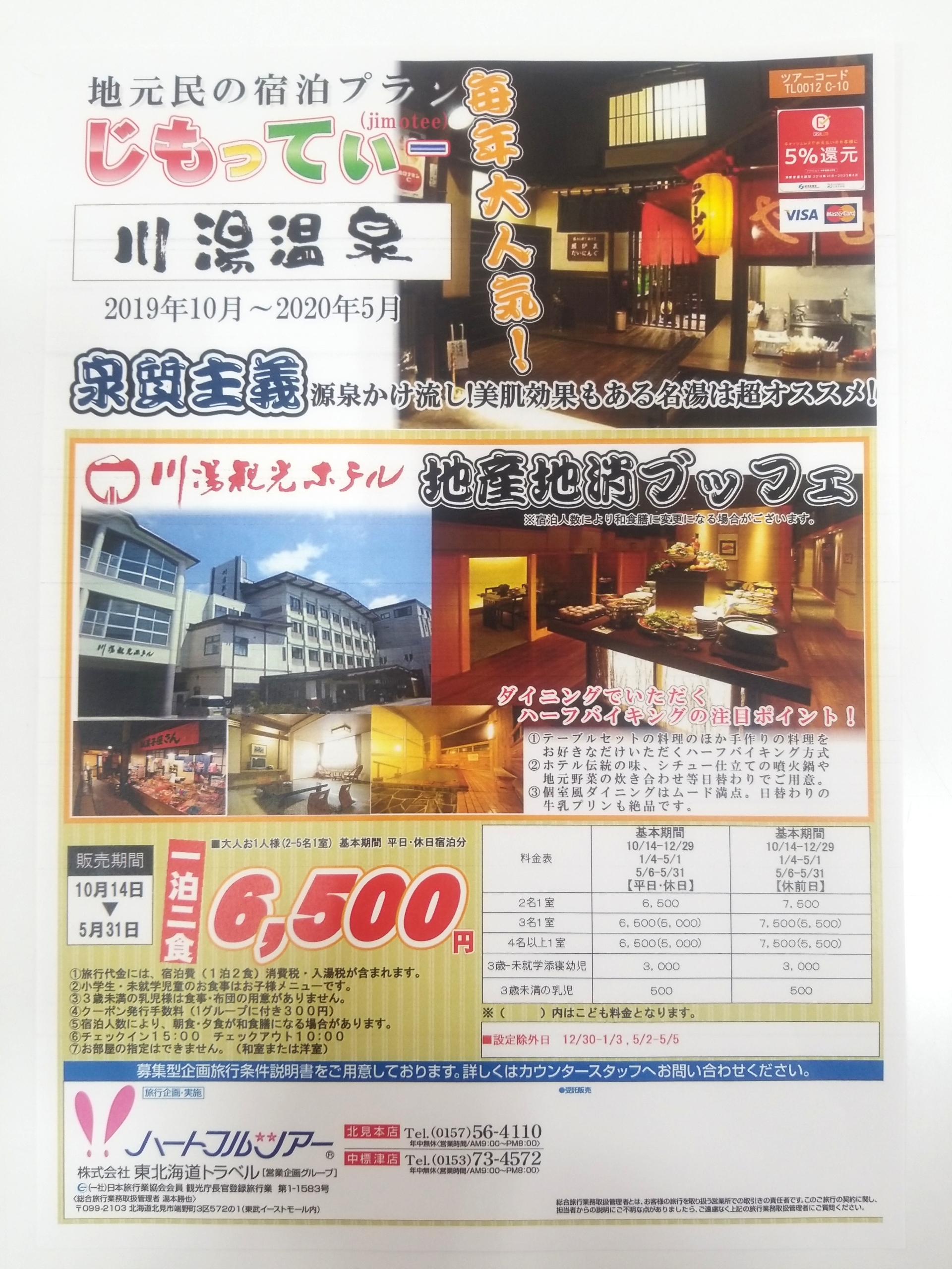 こんにちは!東北海道トラベル ハートフルツアーよりご案内です^^ 遠方へのご旅行を控えていらっしゃる方も多いかと思いますが、近場の温泉で日頃の疲れを癒しませんか? 川湯観光ホテルなら、1泊2食付 大人お一人様6,500円からととってもお得です! 他にも、阿寒・知床・網走・温根湯・十勝川など数多くの温泉宿泊プランを取り揃えております♪ お得に温泉へ行くなら今がチャンスです! 詳しくは、東北海道トラベル ハートフルツアーまでお気軽にお問い合わせください^^ TEL 0153−73−4572