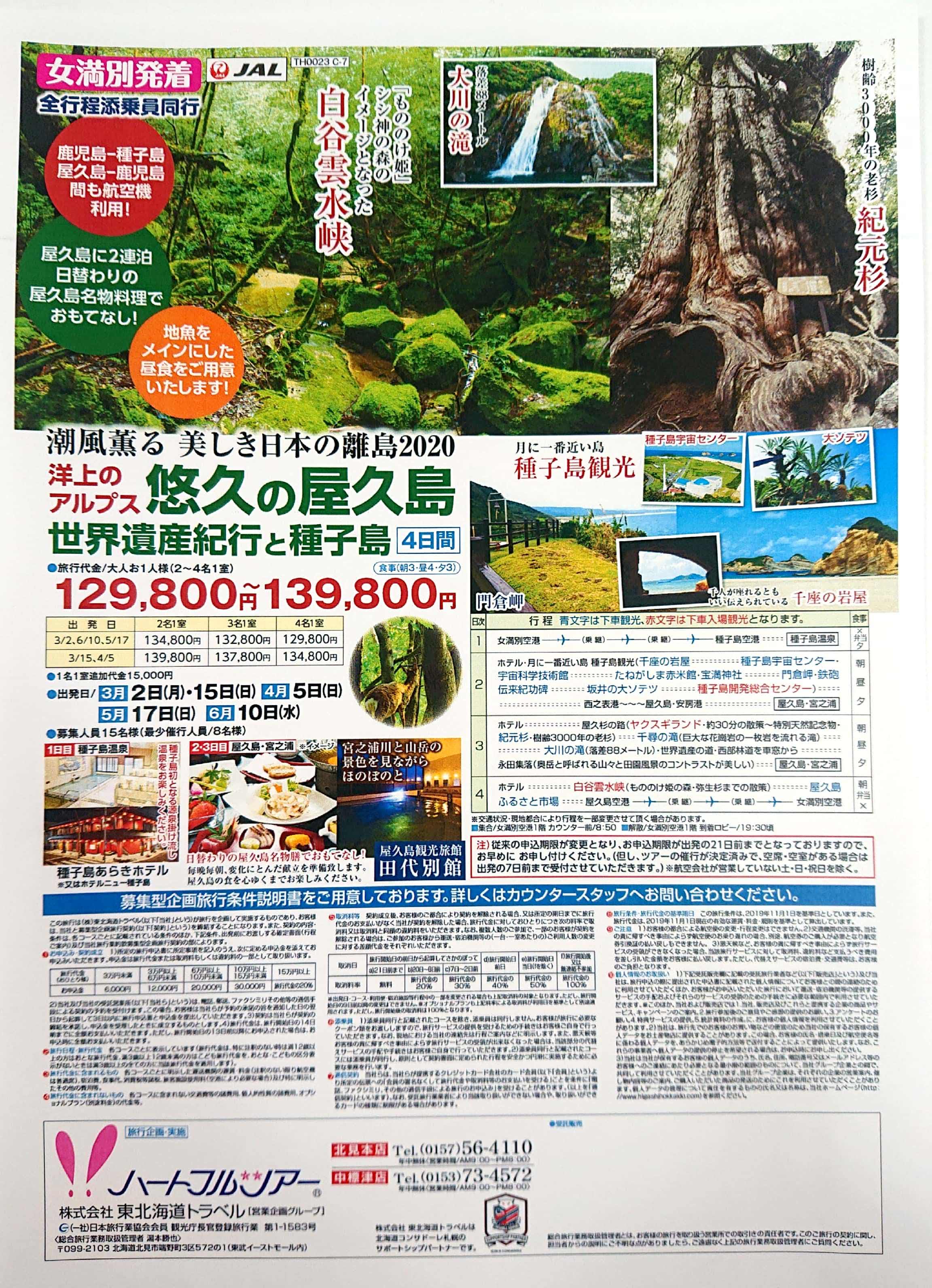 こんにちは!東北海道トラベル ハートフルツアーよりご案内です!(^^)! 女満別発着全行程添乗員同行ツアー「悠々の屋久島 世界遺産紀行と種子島4日間」発売中です! 樹齢3000年の特別天然記念物「紀元杉」や、