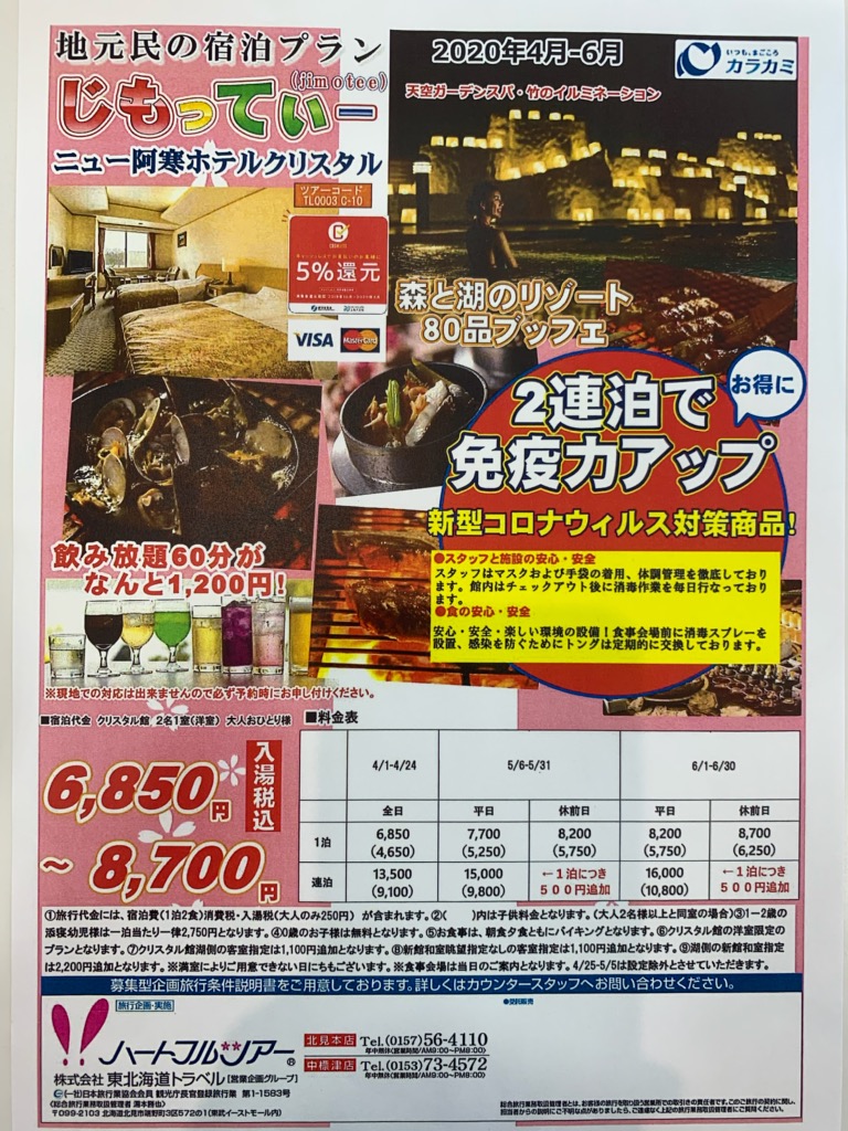 こんにちは!東北海道トラベル ハートフルツアーよりご案内です♪外出自粛が続きそろそろ疲れてしまいますね。温泉に入ってリフレッシュされるのはいかがでしょうか。 「ニュー阿寒ホテルクリスタル館」ではおひとり様1泊2食7700円からご宿泊可能です! もちろん新型コロナウイルス対策として、消毒の強化・衛生管理の徹底・従業員のマスク着用など対策を行っております! 当日のご宿泊も可能です!どうぞお気軽にお問い合わせください!TEL 0153-73-4572
