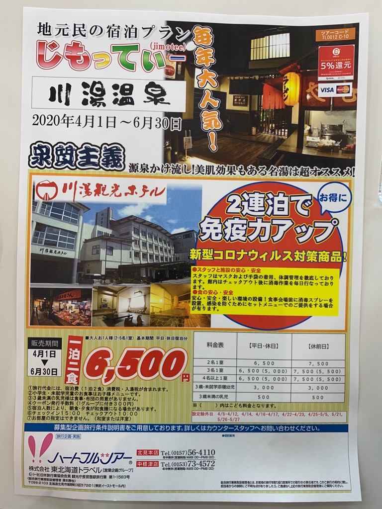 こんにちは!東北海道トラベルハートフルツアーよりご案内です。 源泉かけ流し!美肌効果もあるといわれる川湯温泉でおいしい食事と温泉に入ってリフレッシュしに行きませんか? なんと1泊2食付きで6500円からご宿泊いただけます! 空きがあれば当日でもご予約可能! 詳しくは東北海道トラベルまでどうぞお気軽にお問い合わせください!TEL 0153-73-4572