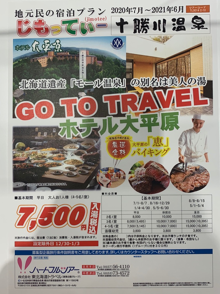 こんにちは!東北海道トラベルハートフルツアーよりご案内です。 地元民の宿泊プラン「じもってぃー」からGOTOTRAVELホテル大平原が発売中です。 美人の湯ともいわれる十勝川のモール温泉。ホテル大平原では1泊7,500円からご宿泊いただけます。 見どころたくさんな十勝でリフレッシュされてはいかがでしょうか。 もちろんお電話でもご予約可能です!お気軽にお問い合わせくださいませ。東北海道トラベル中標津店TEL 0153-73-4572
