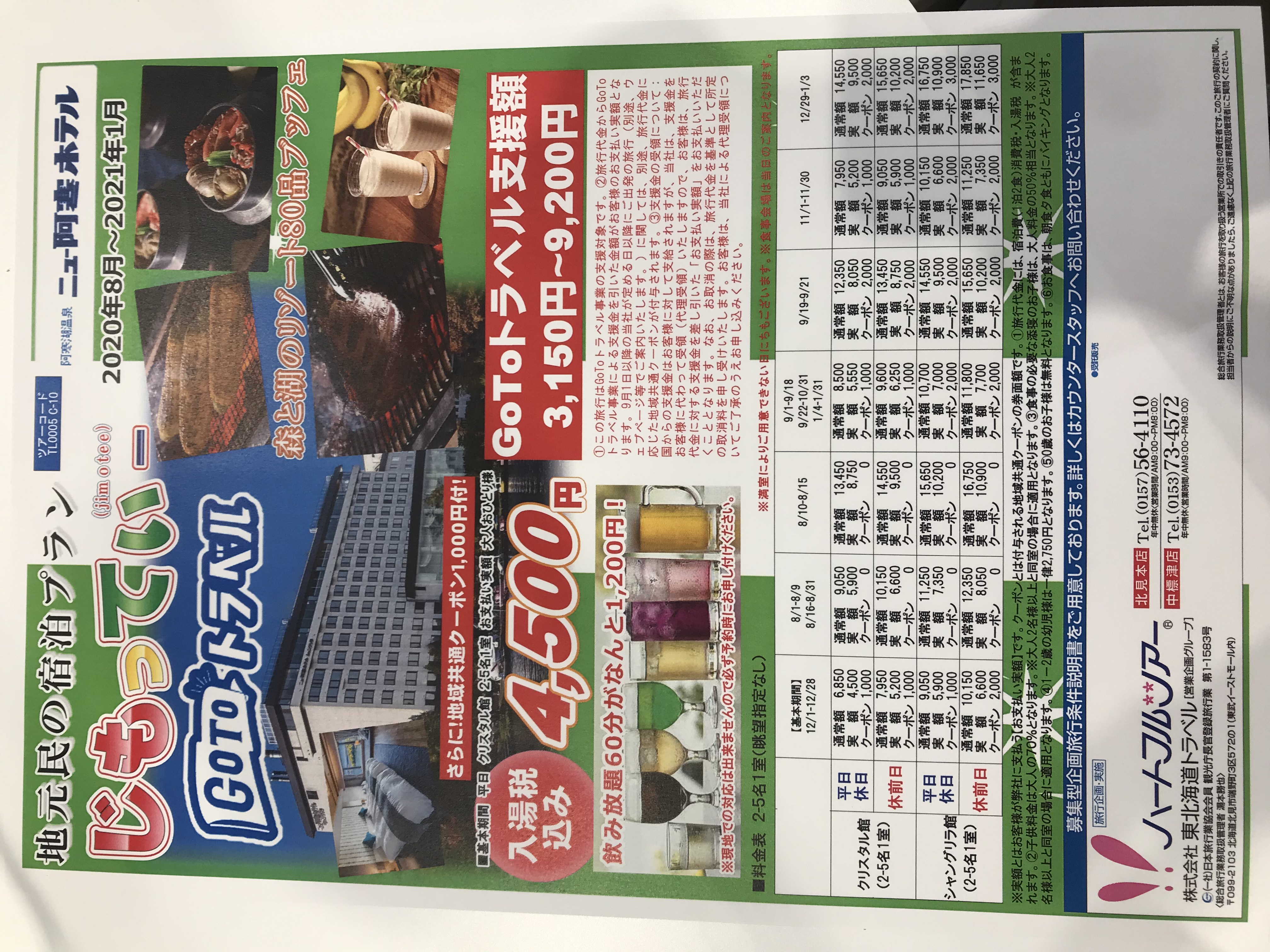 こんにちは!東北海道トラベルよりご案内です(*^^*)GOTOトラベルキャンペーンでお得に温泉旅行にお出かけしませんか?四季折々の味覚を楽しむ彩り豊かなブッフェが人気のニュー阿寒ホテル!GOTOトラベルキャンペーン適用で1泊4,500円からご宿泊いただけます。また1,200円で飲み放題60分も追加できます!ご予約、お問い合わせお電話でも承っております。空きがあれば当日でもご宿泊いただけますよ(^^)お気軽にハートフルツアーまでお電話ください。TEL 0153−73−4572