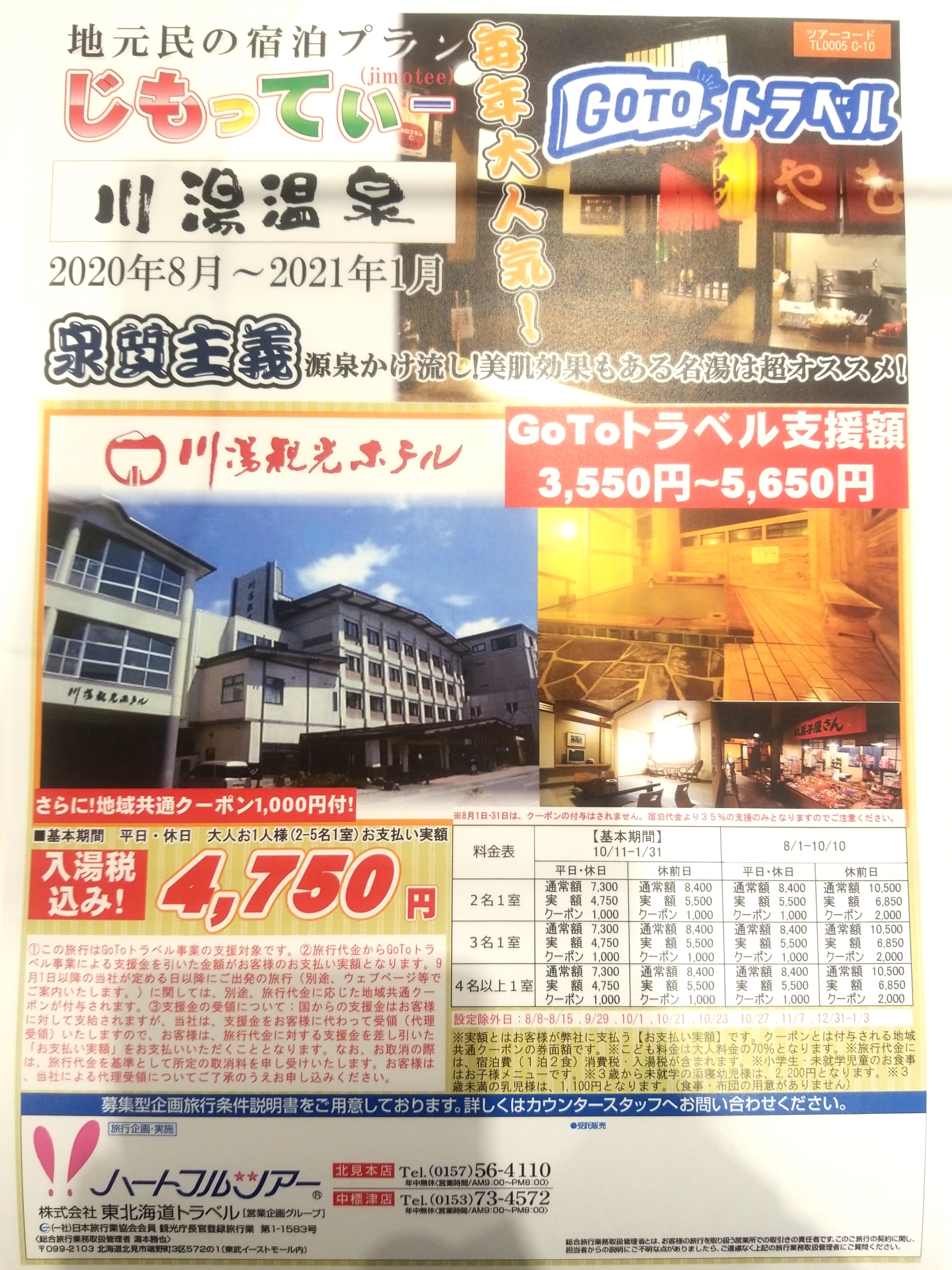 こんにちは!東北海道トラベル ハートフルツアーよりご案内です^^ 中標津から1時間程で行ける「川湯観光ホテル」でのんびり過ごしませんか? 川湯観光ホテルもGoToキャンペーン対象です!1泊2食付 通常7,300円からのところ、割引適用でなんと4,750円から!! ご家族、ご夫婦、お友達とちょっとしたドライブなどにもオススメです♪ 詳しくは、東北海道トラベル ハートフルツアーまでお気軽にお問い合わせください! TEL 0153−73−4572