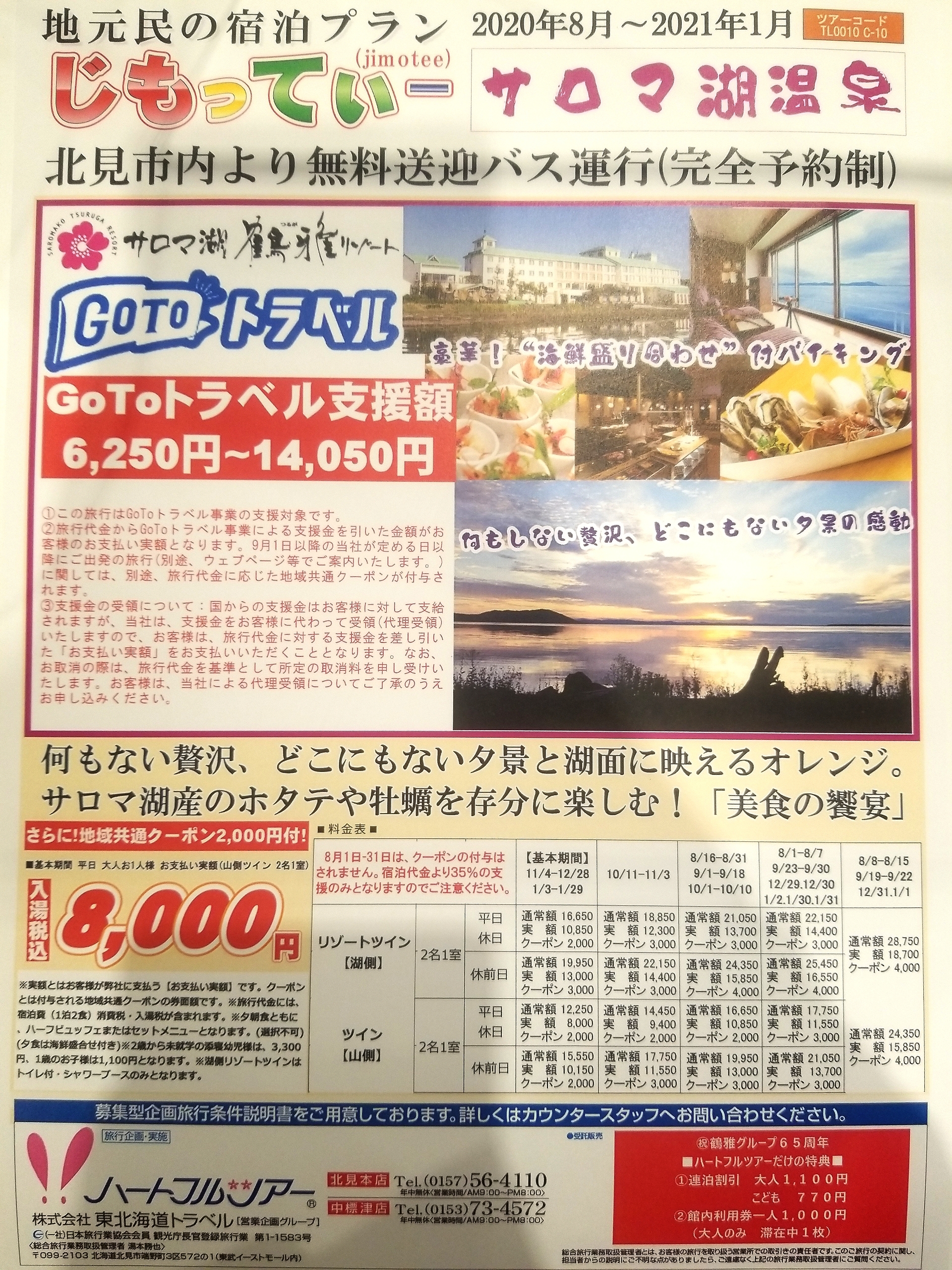 こんにちは!東北海道トラベル ハートフルツアーよりご案内です^^ サロマ湖鶴雅リゾートのお得な宿泊プランが好評発売中! 海鮮盛り合わせ付きバイキングがお楽しみいただけます♪ 山側ツインなら、1泊2食付 お一人様 8,000円から!湖側リゾートツインなら、1泊2食付 お一人様 10,850円から! GoToキャンペーン利用でとってもお得です! 詳しくは、東北海道トラベル ハートフルツアーまでお気軽にお問い合わせください^^ TEL 0153−73−4572