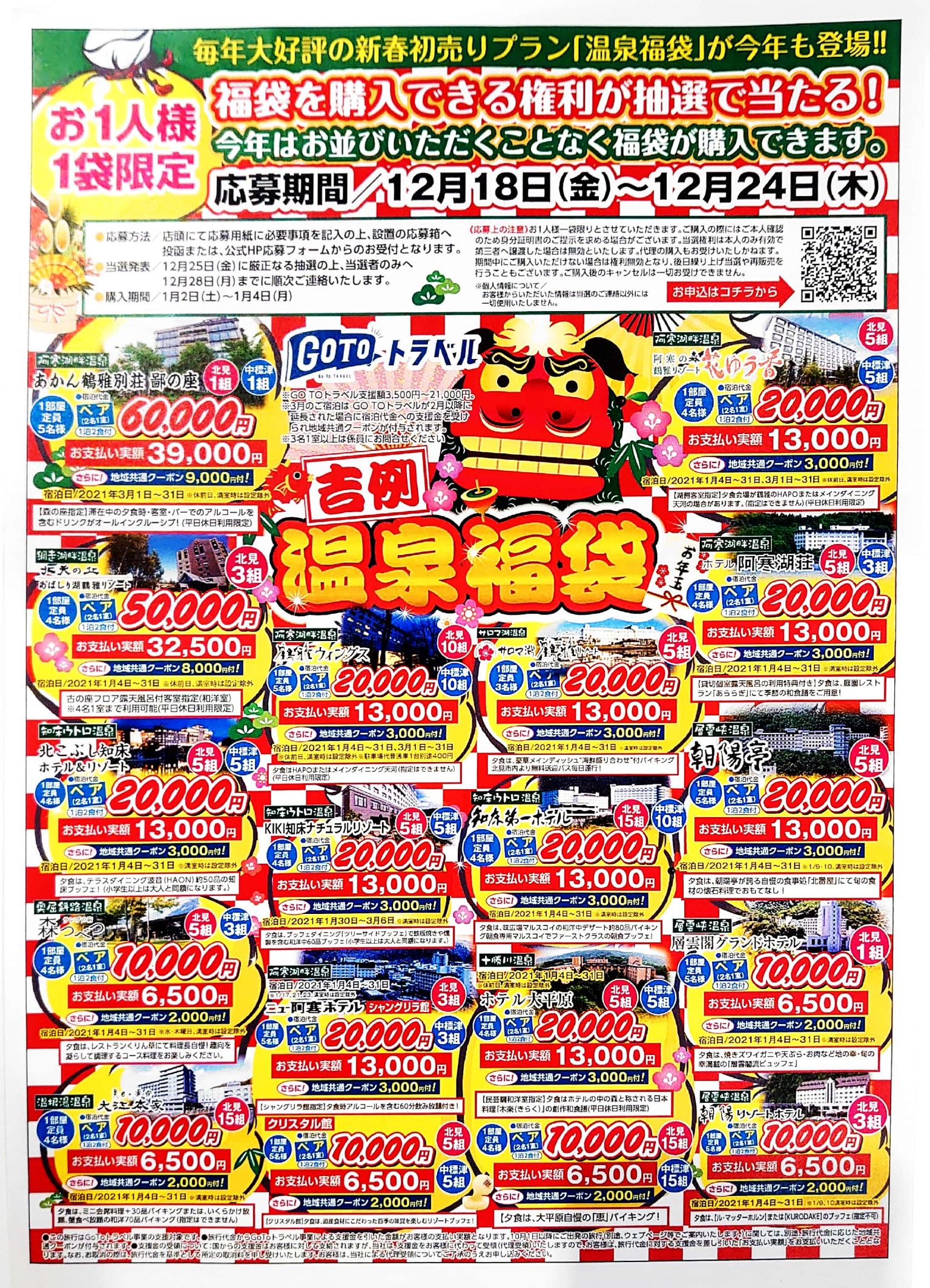 毎年恒例・大好評の「温泉福袋」!今年は密を避けるため、抽選で行います!
