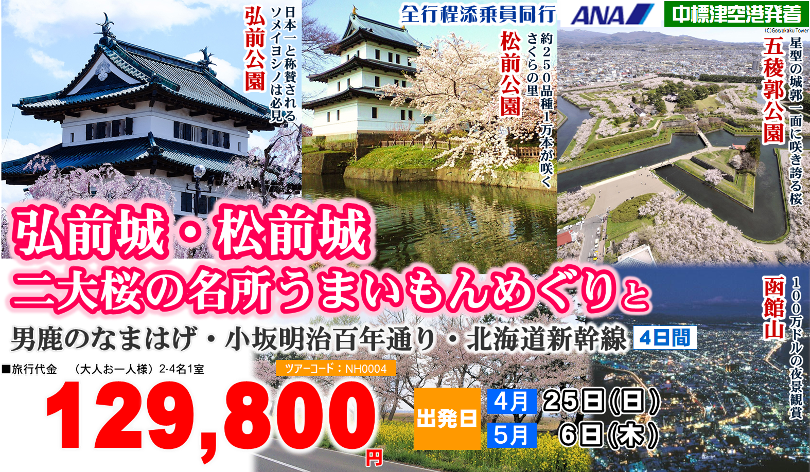 〈中標津発着〉弘前城・松前城 桜の名所とうまいもんめぐり 4日間 ‼