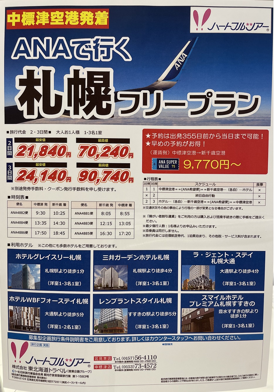 中標津空港発着!ANAで行く札幌フリープラン発売中です(*^^*)