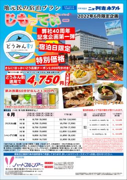 こんにちは。 東北海道トラベルハートフルツアーよりご案内です。 2022年6月で東北海道トラベルハートフルツアーは 創立40周年を迎えました。 記念企画第一弾として、 「ニュー阿寒ホテル」特別宿泊プランを発売中です!! 6/17.20.22.27.28.29のご宿泊限定で、 どうみん割適用で1泊2食付き4.750円から!! さらにほっかいどう応援クーポン付き! 是非お気軽にお問い合わせください。 皆様のご相談お待ちしております。 東北海道トラベル中標津店 TEL:0153-73-4572