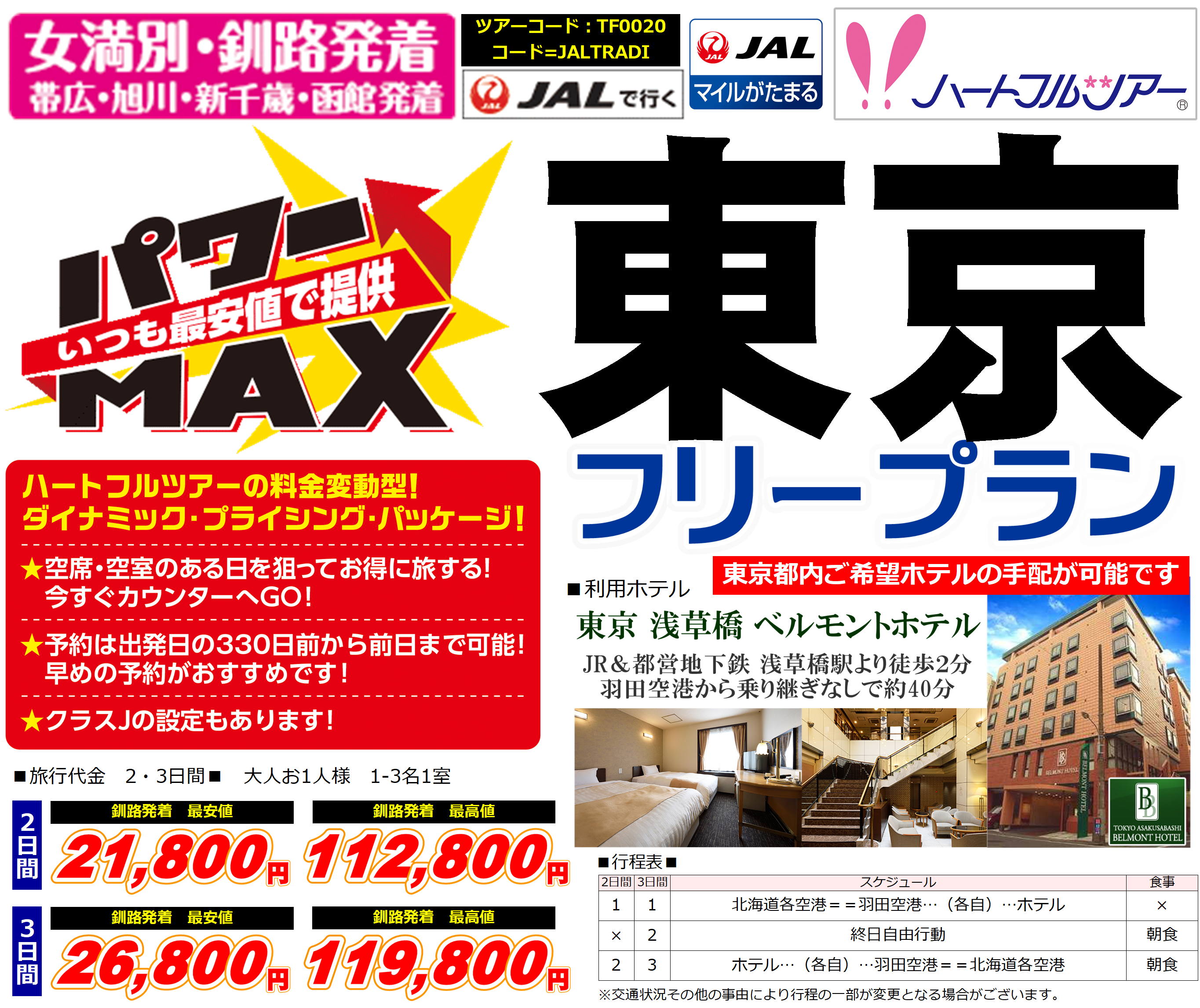 例えば2泊3日東京の浅草橋ベルモントホテル(2泊朝食付)であれば、