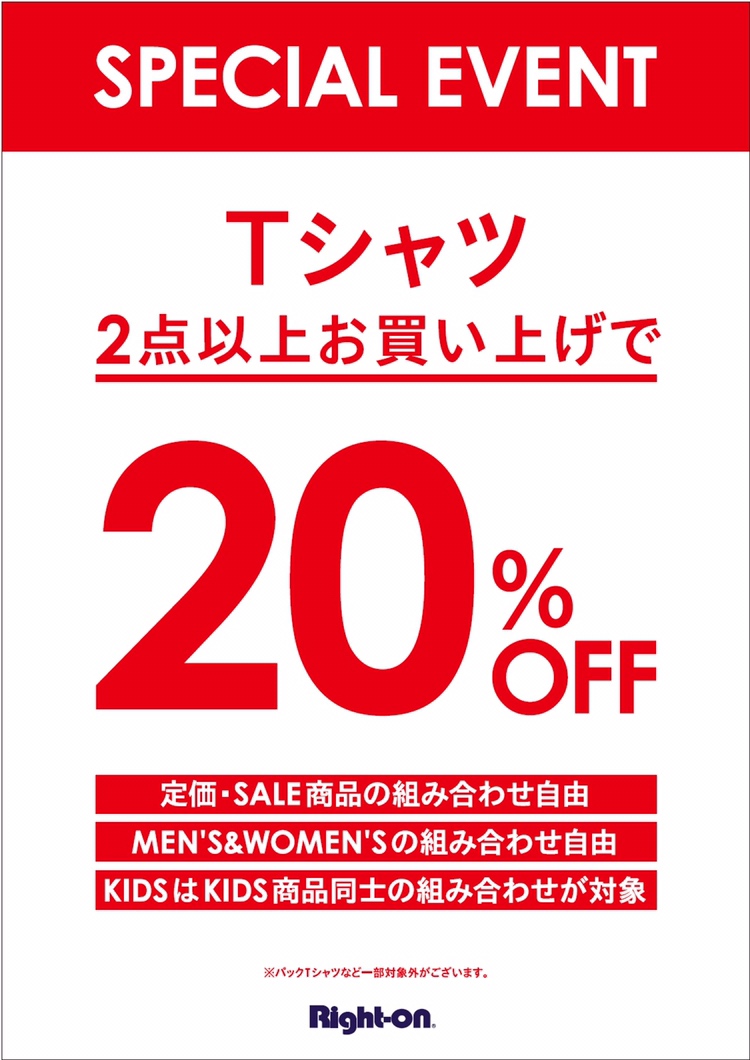 Right-onでは7/17(金)〜7/26(日)の期間中、特別イベント【Tシャツ2点以上でさらに20%OFF】を開催致します!!1枚で決まるプリントTシャツや、トレンドのBIGシルエットTシャツ、コーディネートに欠かせない無地Tシャツ、大人気有名ブランドのTシャツも2点以上で更に20%OFFとなります♪