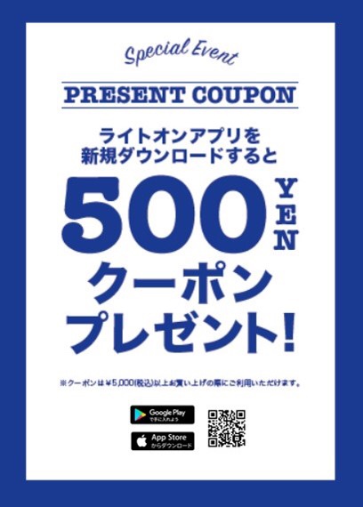 期間中にRight-on公式アプリを新規ダウンロードしていただきますと税抜き5,000円以上のお買い物でご利用頂ける【500円OFFクーポン】をプレゼント♪