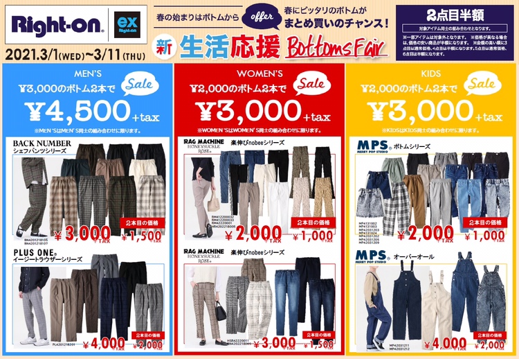 メンズ・レディース・キッズの対象ボトムスが2本目半額となります!!