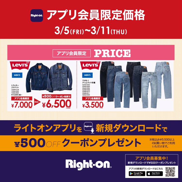 そしてRight-on公式アプリを新規ダウンロードすると税込み5,500円以上のお会計でお使い頂ける【¥500OFFクーポン】も配信中です!!