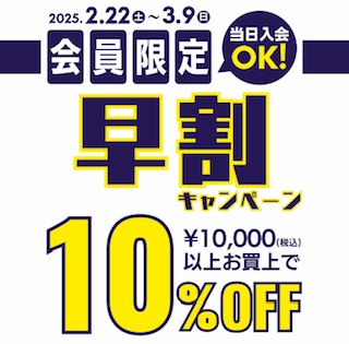 日頃より当店をご愛顧頂き誠にありがとうございます。ただいまライトオンでは、会員限定税込¥10,000以上ご購入でレジにて10%OFFを開催しております。新作の春物アイテムもお得にお買い求め頂けます!! 当日の新規会員登録も割引の対象となりますので、ぜひお誘い合わせの上ご来店下さいませ。 開催期間【2/22〜3/9】