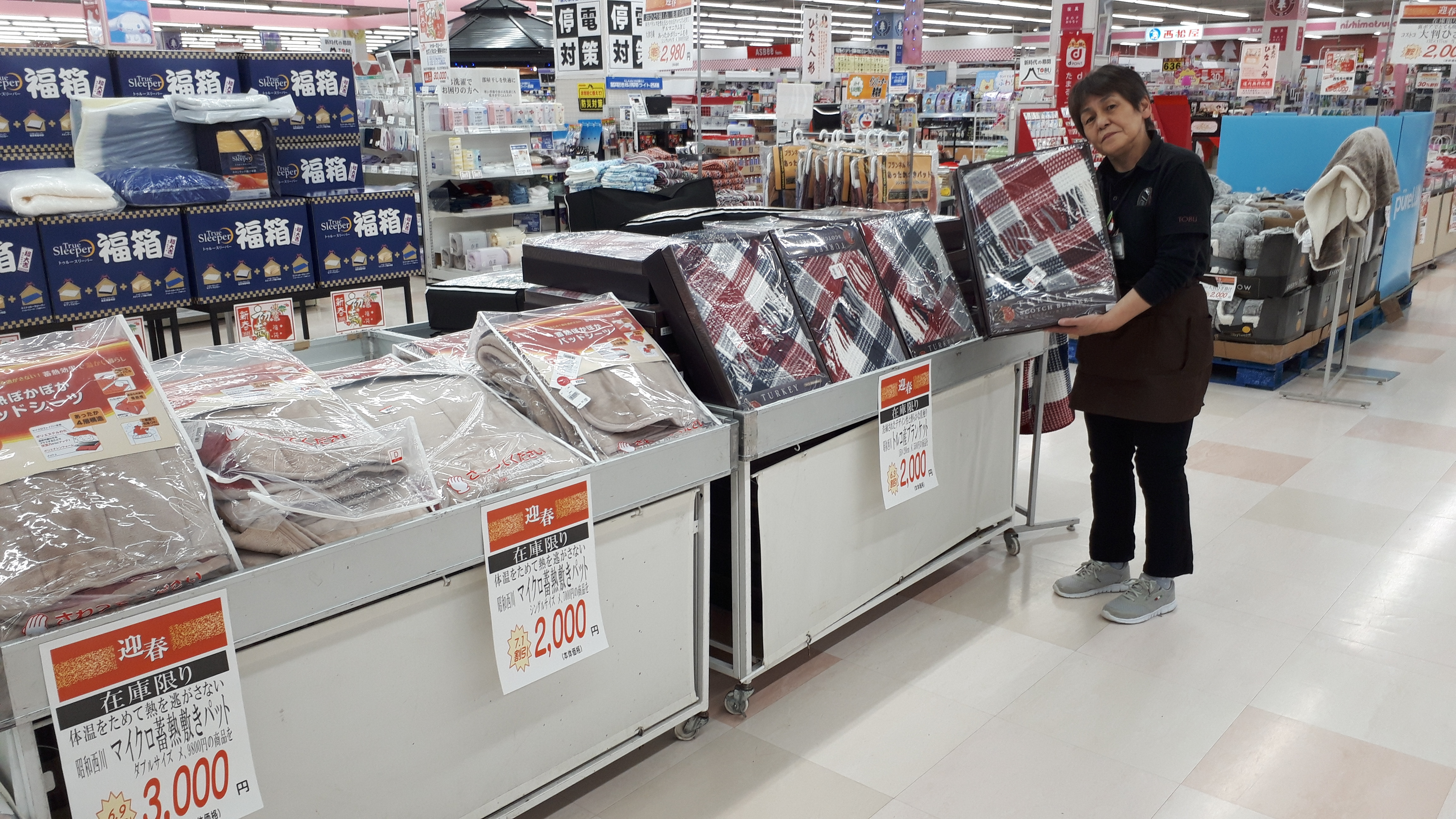 寝具インテリアコーナーよりご案内いたします。本日も引き続き東武の初売り開催!当コーナーではトルコ製ブランケットや西川の発熱敷きパットなど冬物寝具各種を初売り特価でご奉仕しております!ぜひこの機会に当店寝具インテリアコーナーでお買い求めください!