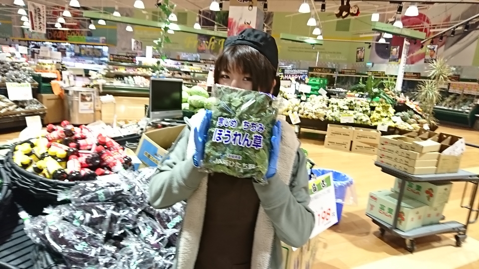 青果担当苫米地より、本日のオススメ商品です。今日ご紹介するのは茨城から直送、ちぢみほうれん草です。冬季限定、肉厚で甘味の強いほうれん草です。ベーコンと一緒にソテーするとお手軽に美味しいおかずが一品出来上がります。今回はちぢみ小松菜も入荷していますので、冬のちぢみ野菜シリーズをぜひご利用ください。