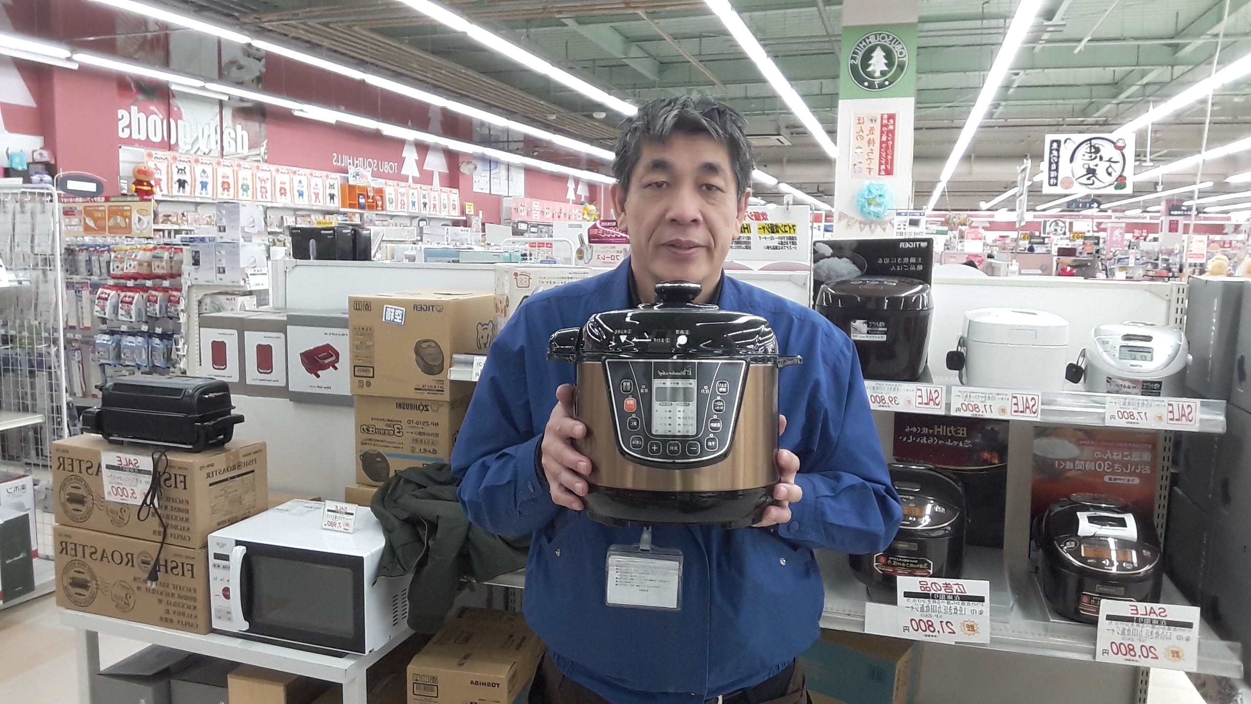 家電コーナーよりご案内いたします。只今当コーナーでは食材を入れてボタンを押すだけで簡単に本格的な調理ができるマイコン電気圧力なべを販売中です!3Lと4Lから容量が選べますのでぜひこの機会に当店家電コーナーでお買い求めください!