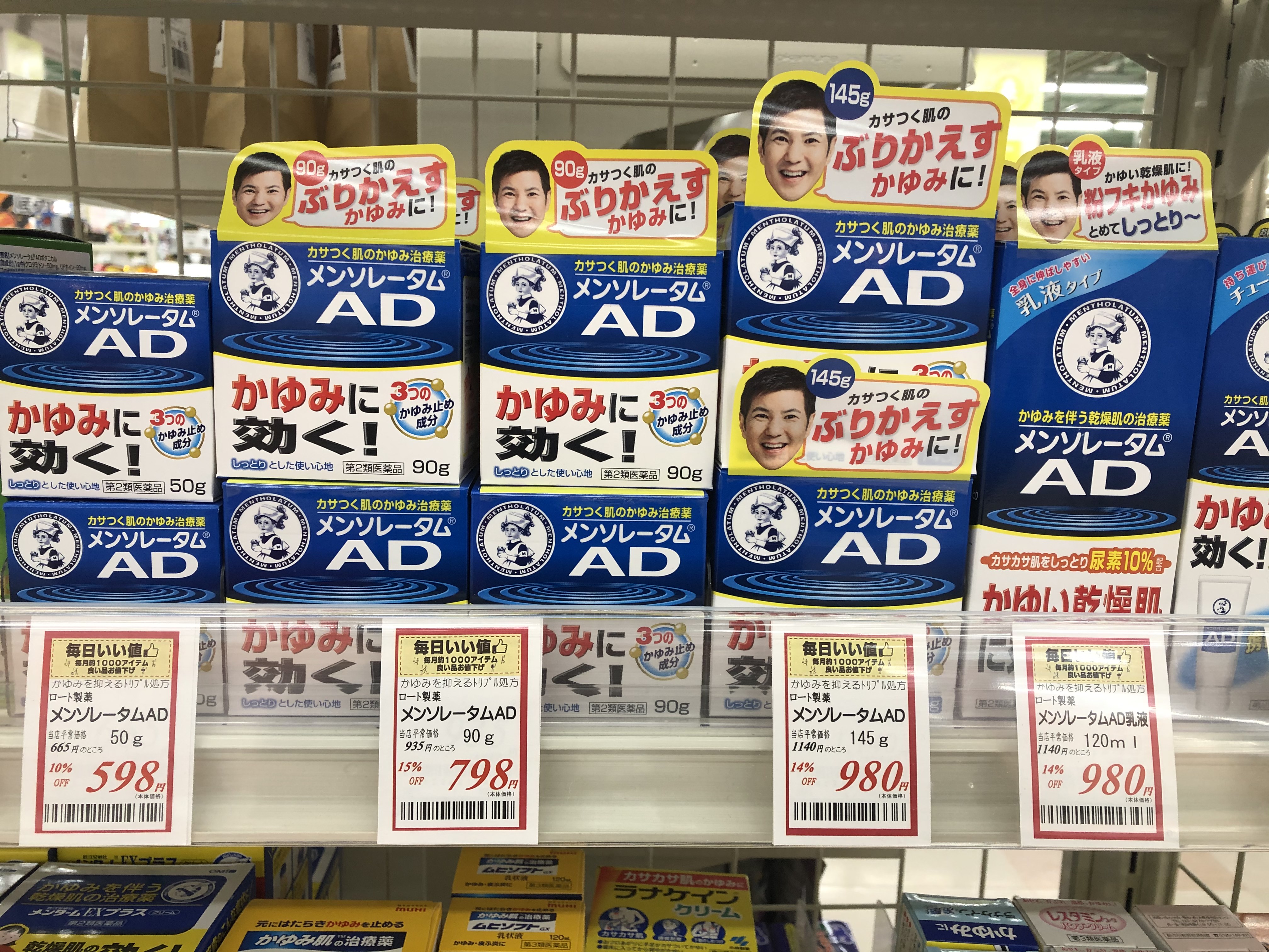 みなさんんこんにちは!今日ご紹介の商品は「メンソレータムAD」です!こちらの商品は3つのかゆみ止めを配合した、肌のかゆみをしっかり抑えてくれる治療薬です!皮フが乾燥すると、角質層の水分や皮脂が減少して皮フが敏感になり、外からのさまざまな刺激によってかゆみが起こりやすくなります。おふろや布団に入って体が温まった時や、下着でこすれたときなどにでる、かかずにいられないかゆみをすばやくスーッとしずめてくれます!乾燥肌でお困りの方にも満足していただける、保湿感にこだわった処方設計で、しっとり感がさらにアップです!気になる方はぜひお試しくださいね!