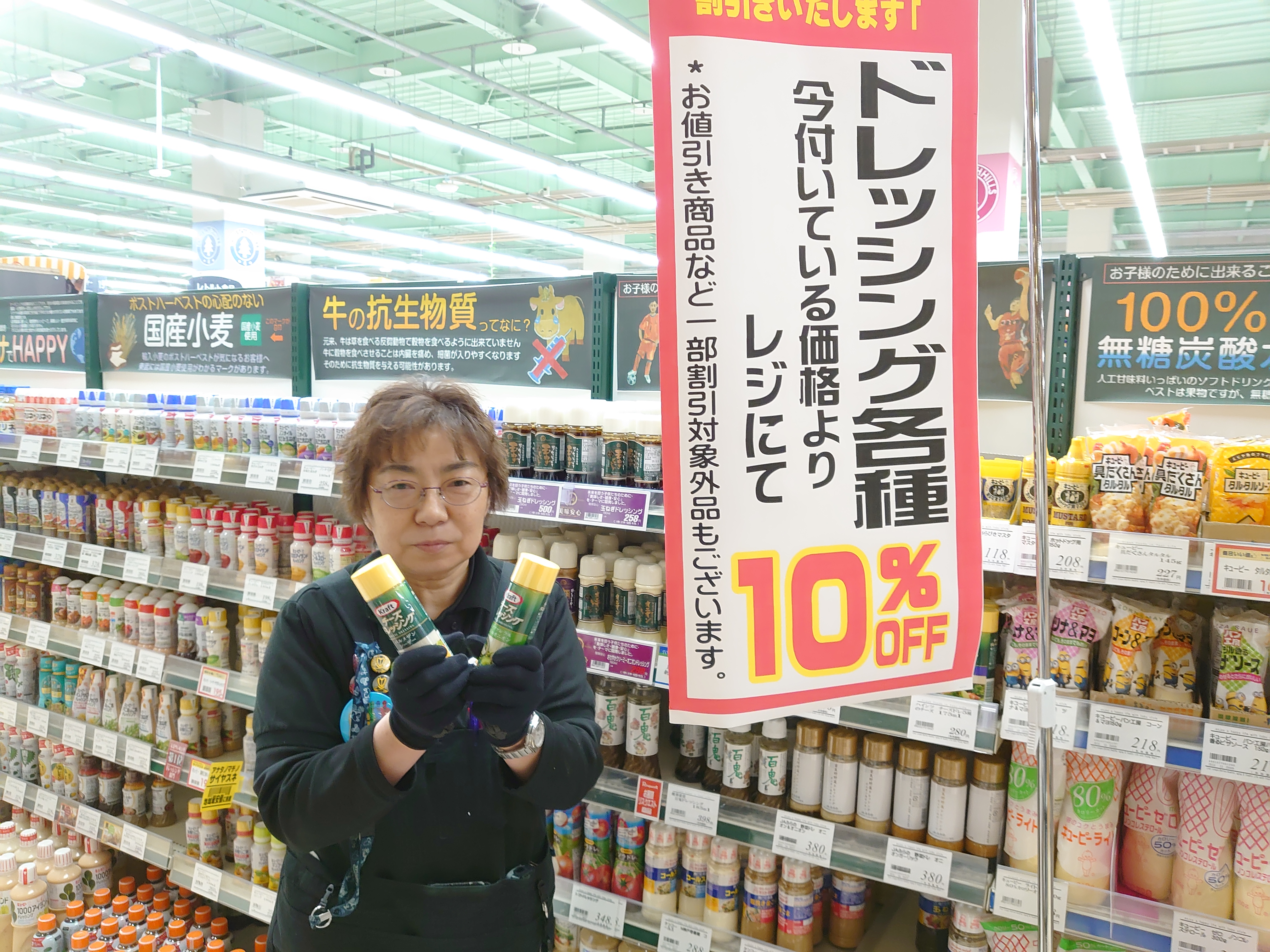 おはようございます本日は日替わり特売といたしましてドレッシング各種がレジにて10%引きとなっております