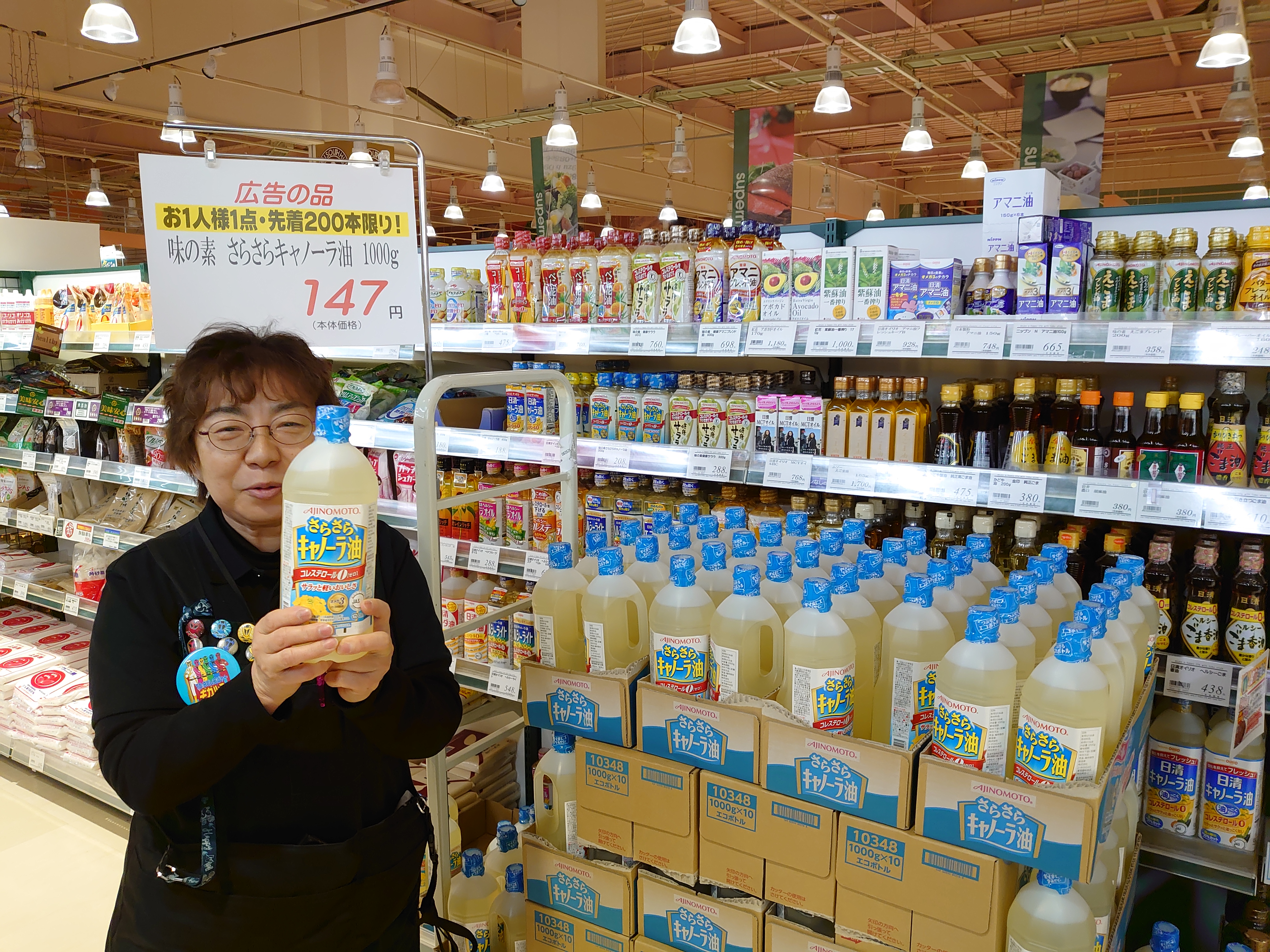おはようございます本日は広告掲載商品といたしまして味の素さらさらキャノーラ油が1L147円となっております限定数量がございますのでぜひお早めにご利用ください!