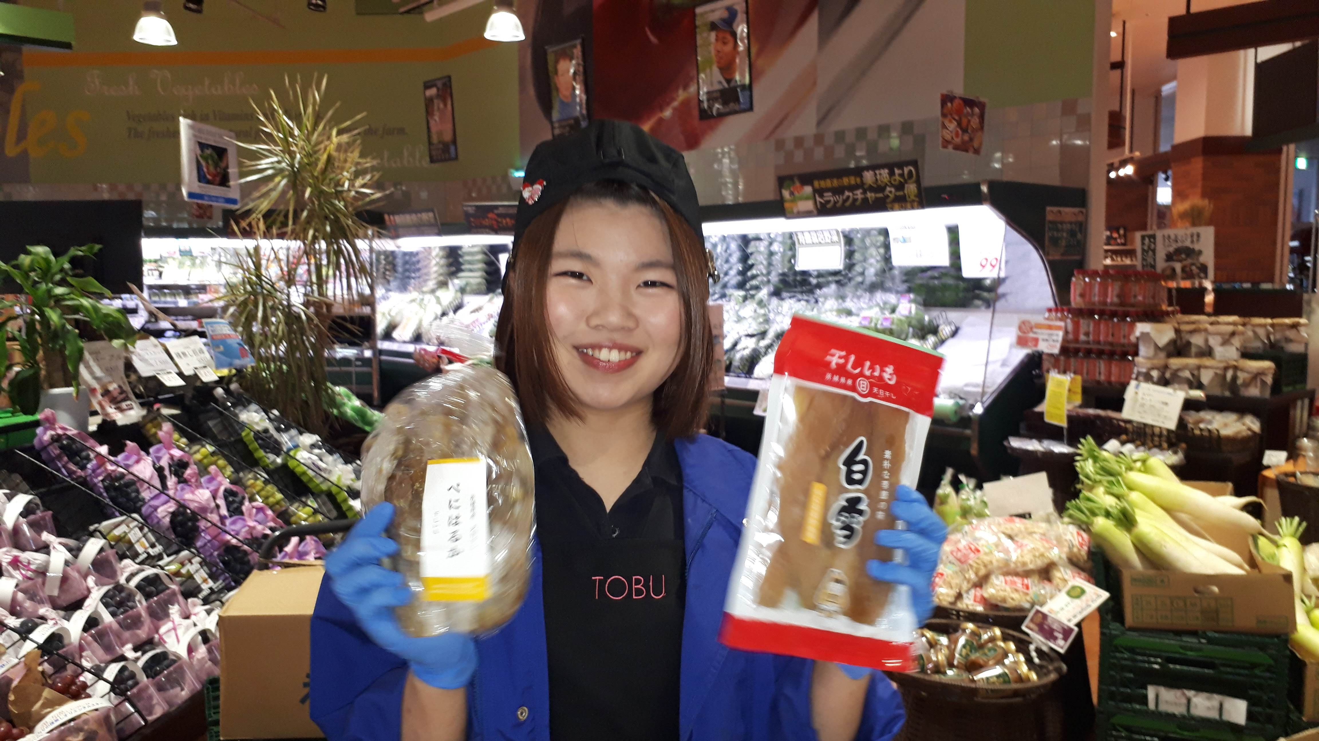 おはようございます。青果コーナーのおすすめは干しいも。当店の干しいもは種類豊富。桃でお馴染みも古屋さんの干しいもやこだわりの干しいもなど、いろんな種類をご用意しています。ぜひご利用ください!