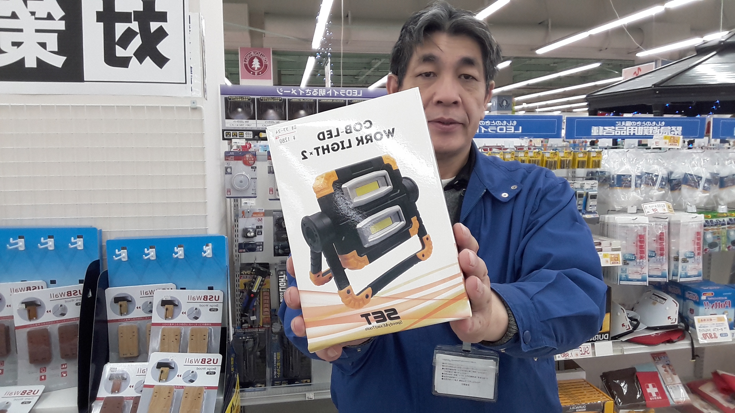 家電コーナーよりご案内いたします。只今当コーナーではもしもの時の備えとしてハンディライト各種をお取り扱い中!COB-Ledワークライトは2ちのライトを搭載、360度回転するのでお好きな角度で作業が可能です!ぜひ当店家電コーナーでお買い求めください!
