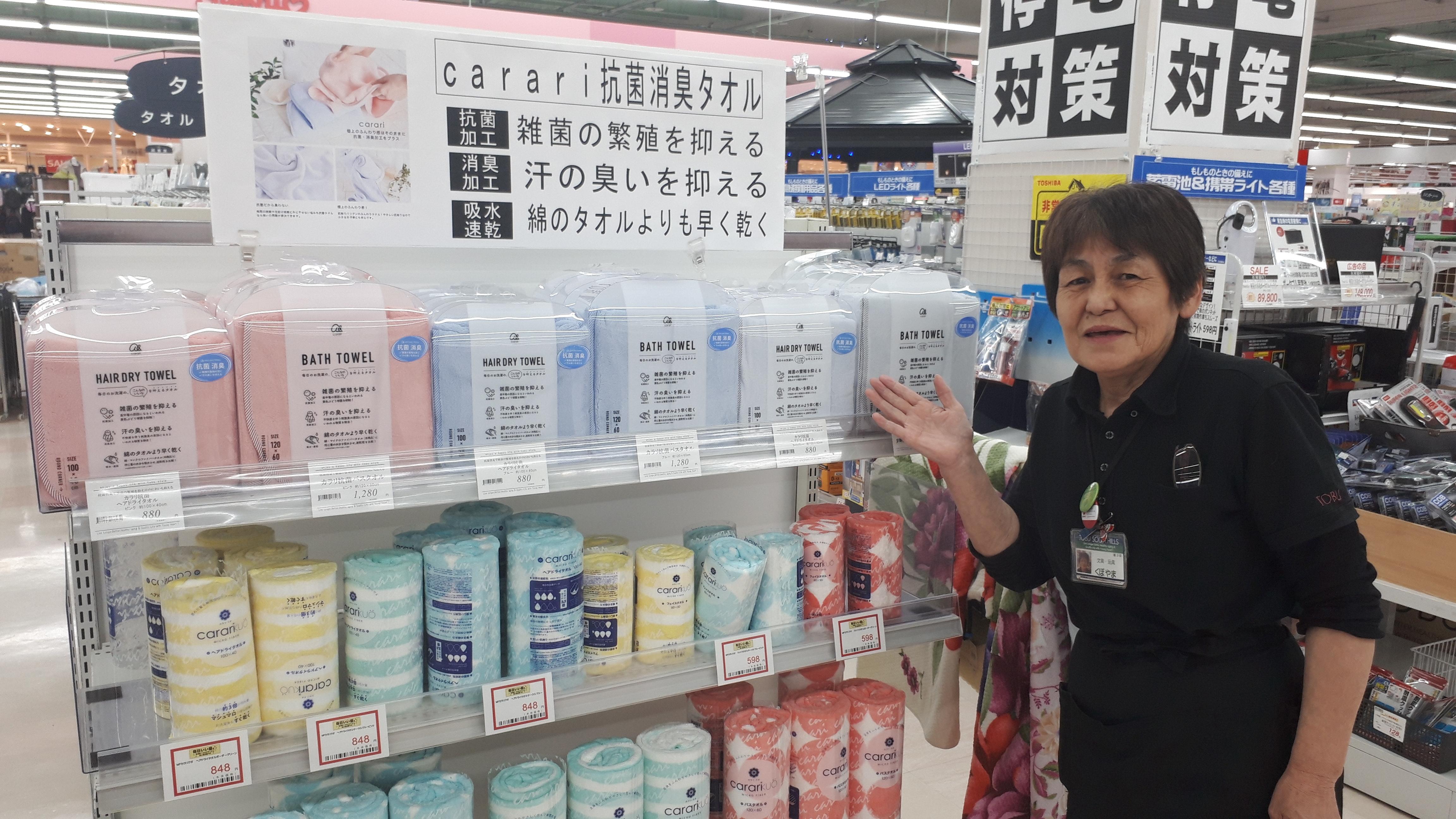 寝具インテリアコーナーよりご案内いたします。雑菌の繁殖を抑え、汗などの臭いも抑える抗菌消臭タオルが人気です!部屋干しの臭いも気にならず乾きも早いカラリ抗菌タオルは今なら価格もお買得!ぜひこの機会に当店寝具インテリアコーナーでお買い求めください!