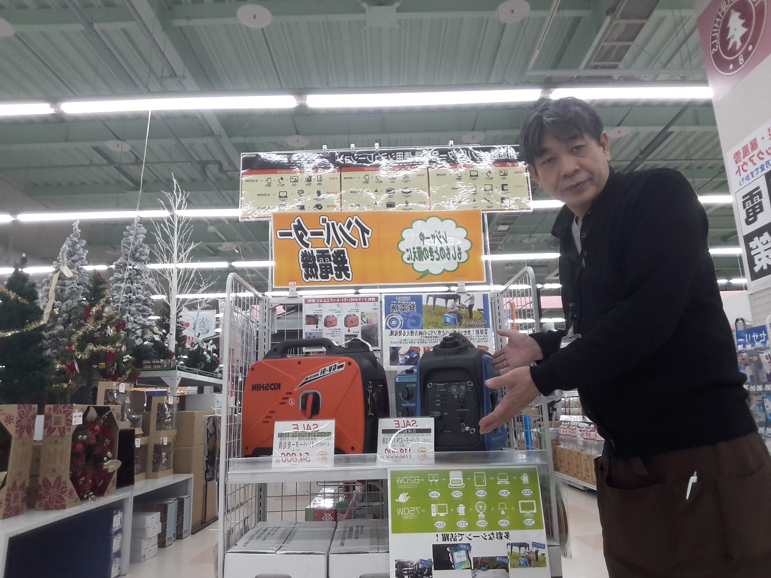 家電コーナーよりご案内いたします。只今当コーナーではもしもの時の備えにも使えるインバーター発電機をお取り扱い中です!お手頃な900wタイプから大容量の2800wタイプまで色々取り揃えておりますのでぜひお買い求めください!